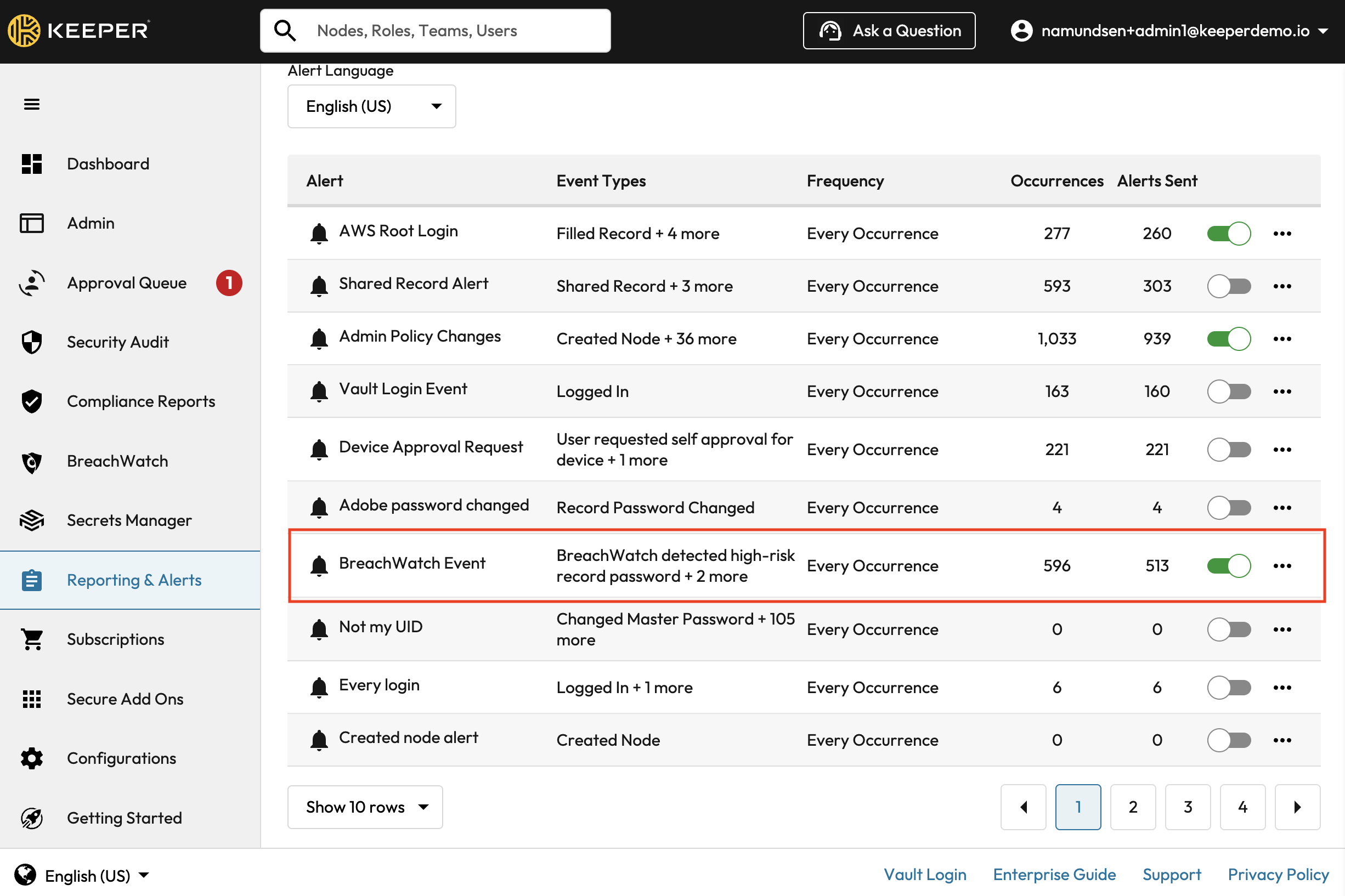 BreachWatch provides Admins a dashboard overview and a summary table in the Admin Console detailing how users have dealt with their BreachWatch notifications.