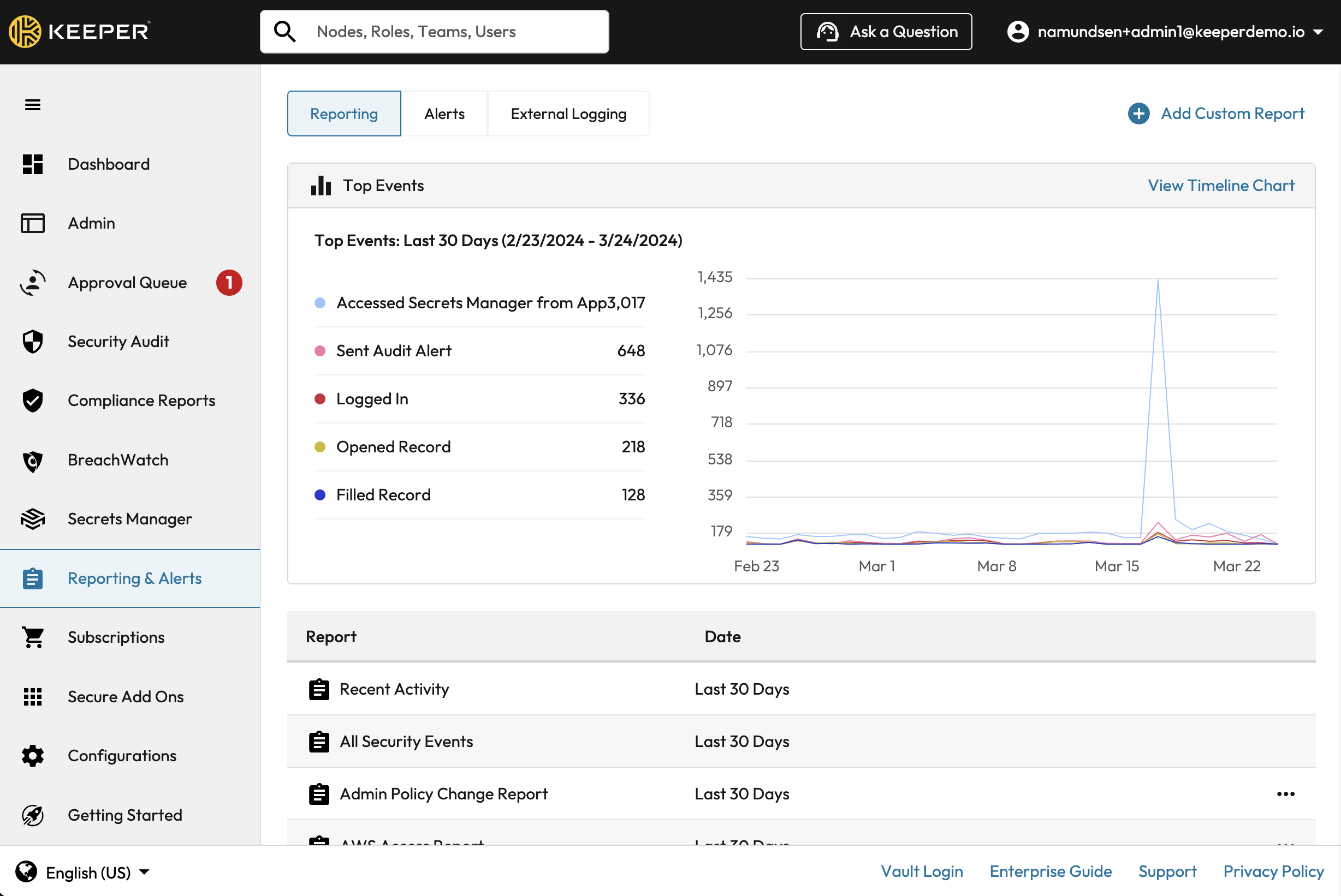 By default, Keeper does not send BreachWatch event data from the user's device to connected SIEM and Advanced Reporting & Alerts reporting tools. The Keeper Admin must explicitly enable this feature. After it's enabled, the event data will begin to flow through to the Advanced Reporting engine and connected SIEM systems such as Splunk.