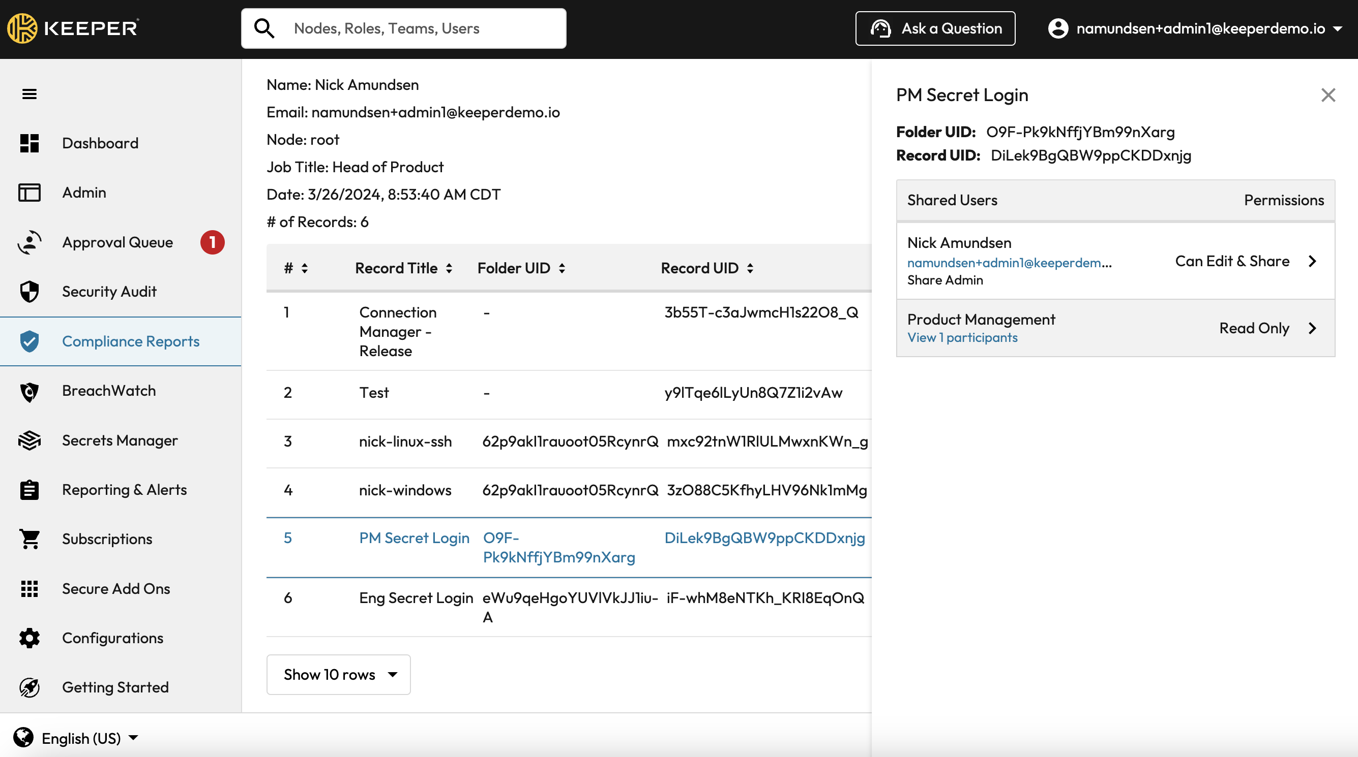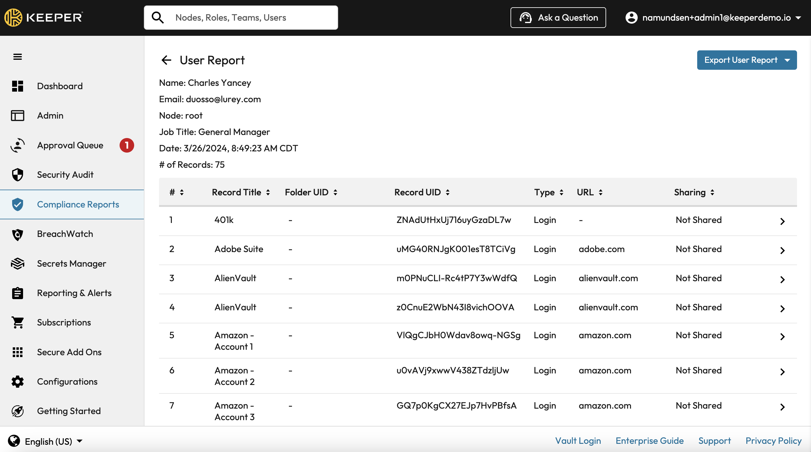 Decommissioning user report: Before decommissioning users and transferring their Keeper accounts, run a report showing all the users’ owned records.