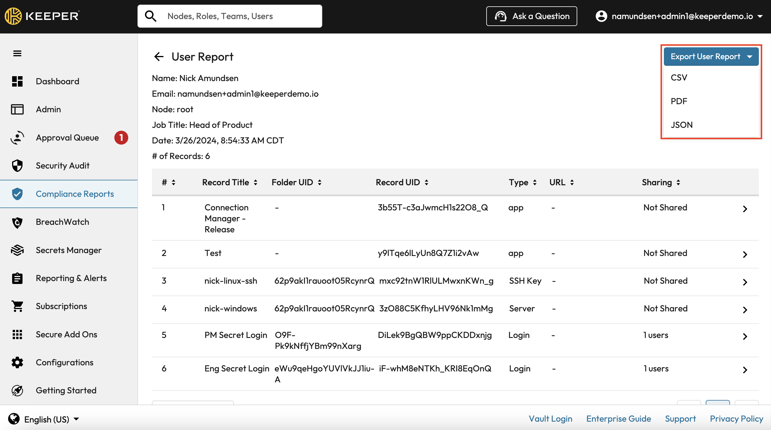 The encrypted audit data is delivered to the Admin Console and the Admin is able to decrypt audit data locally on their device using the Elliptic Curve Enterprise Private Key. The report contents are then displayed locally on the user interface and available for export into CSV, JSON or PDF format. Only the designated Keeper administrator can retrieve and decrypt the compliance report data for the nodes that they have been granted admin rights over.