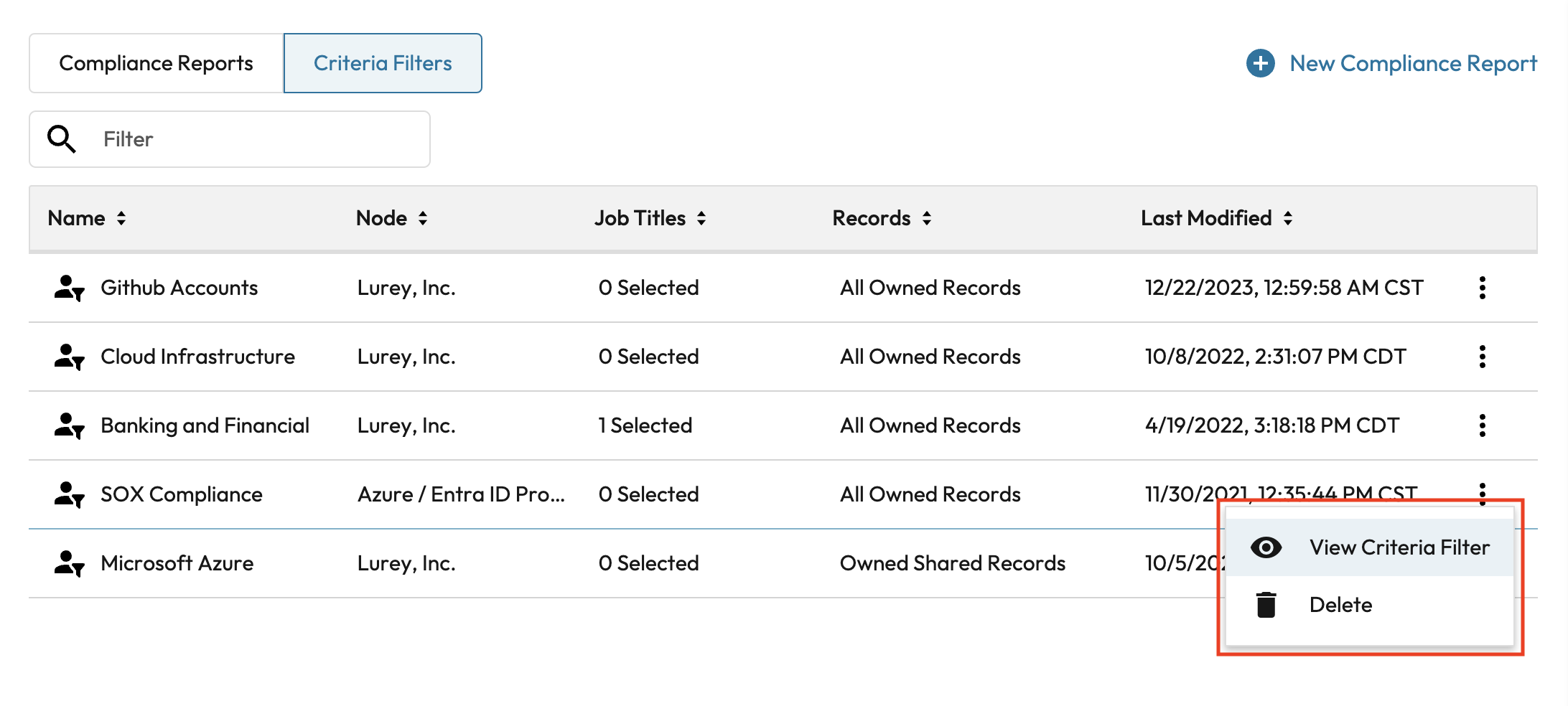 Select “Criteria Filters” to see the report criteria that have been saved. To create new report criteria, select “New Compliance Report”, name the criteria and then save it by selecting “Save Filters”.