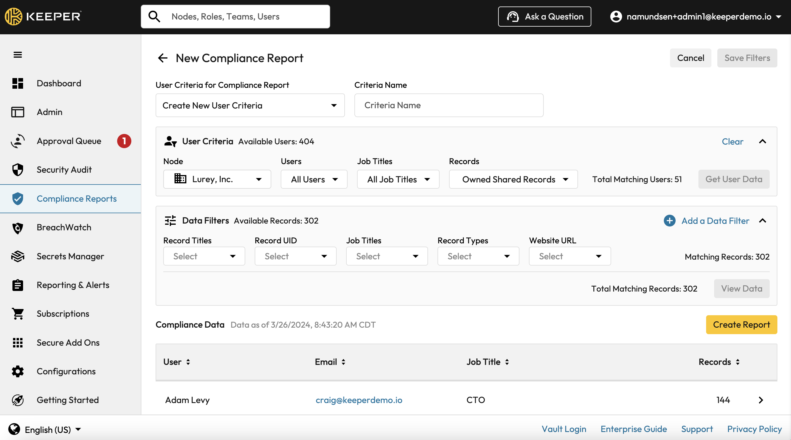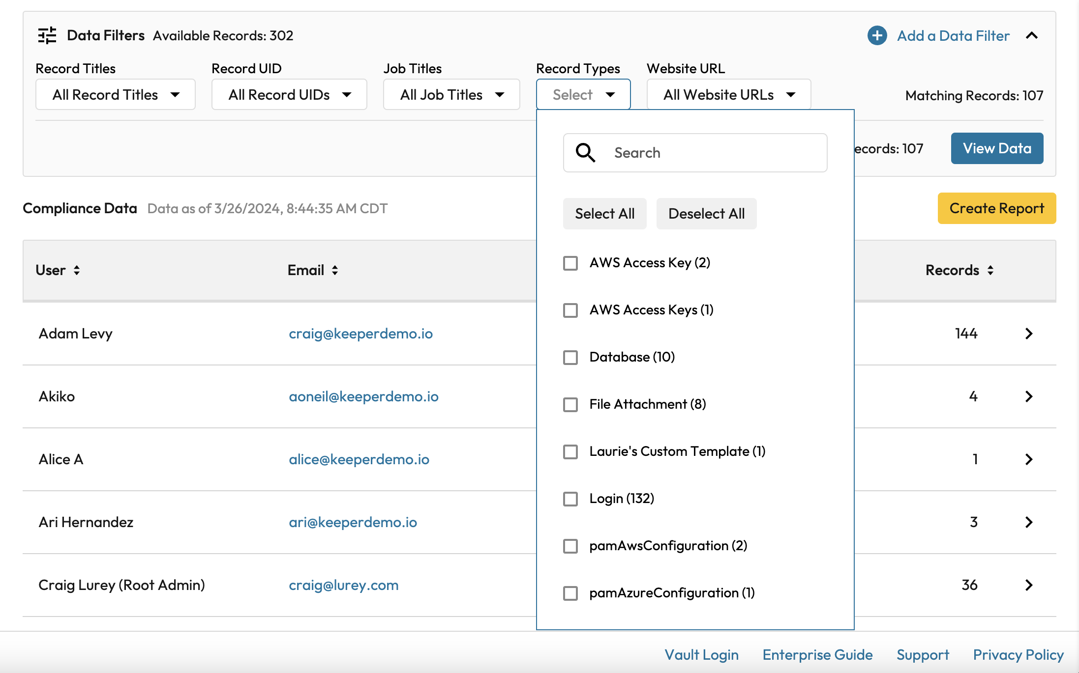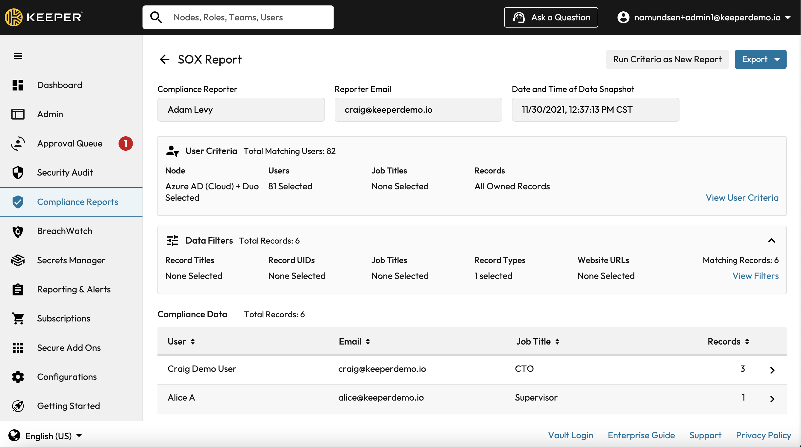 Compliance Reports provide on-demand visibility to access permissions on records and credentials in your enterprise. These reports simplify the compliance auditing process for Sarbanes Oxley (SOX) and other regulations requiring periodic access control auditing. These Keeper Administrator-defined Compliance Reports run on-demand and can be forwarded to automated compliance systems or sent directly to external auditors. Since the reports contain some non-credential encrypted record data, an administrator must have permission to run and view these reports. The encrypted record data is included in the report and can also be used as report filters.