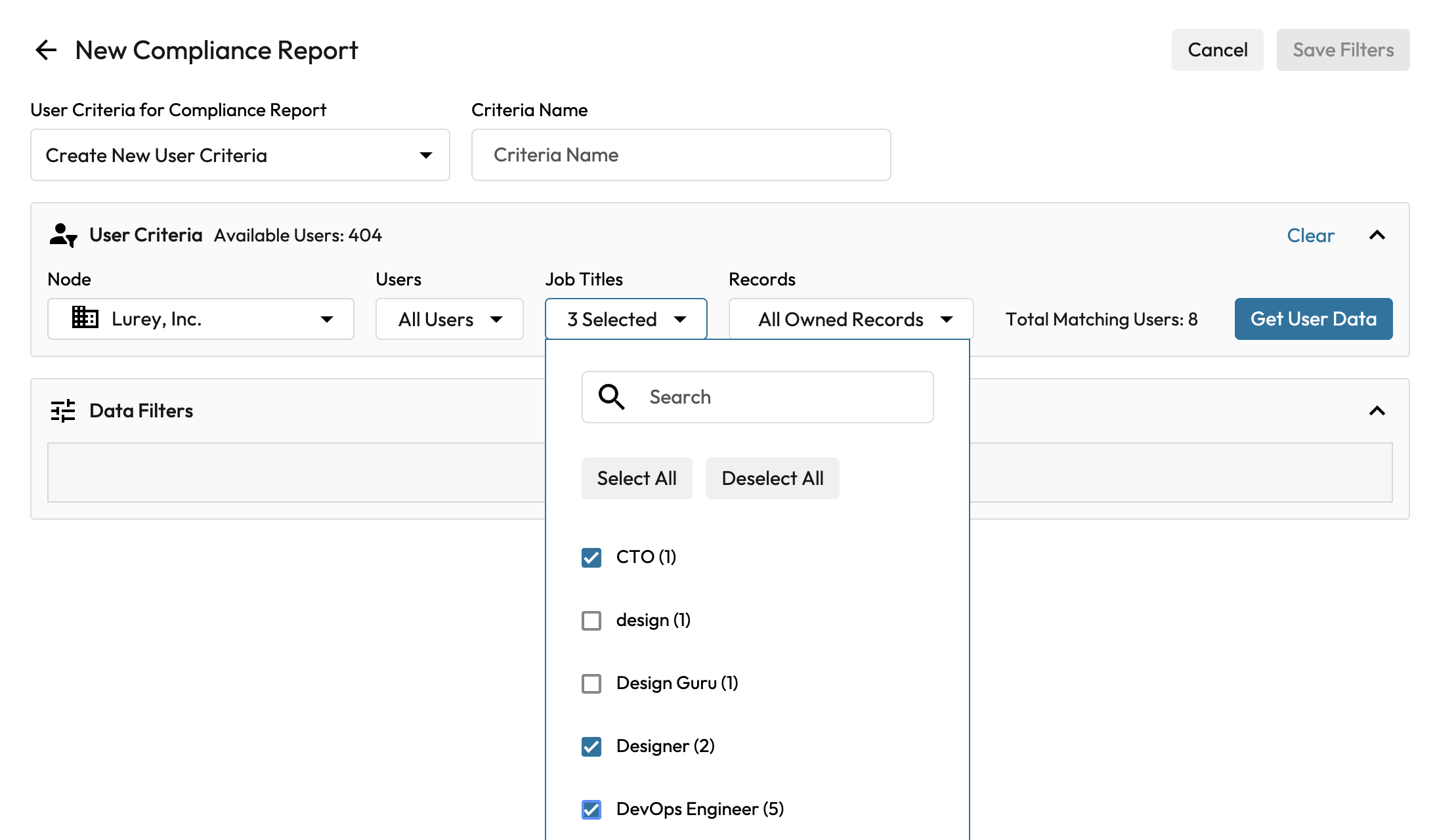 The “Node” selected will determine the report association and also the users available for the report. “Job Titles” are available if manually entered in user data or imported via a CSV file. In a future release, “Job Titles” will be available via import from an IdP using SCIM provisioning. “Records” may include all owned records or only those records which are owned and also shared.
