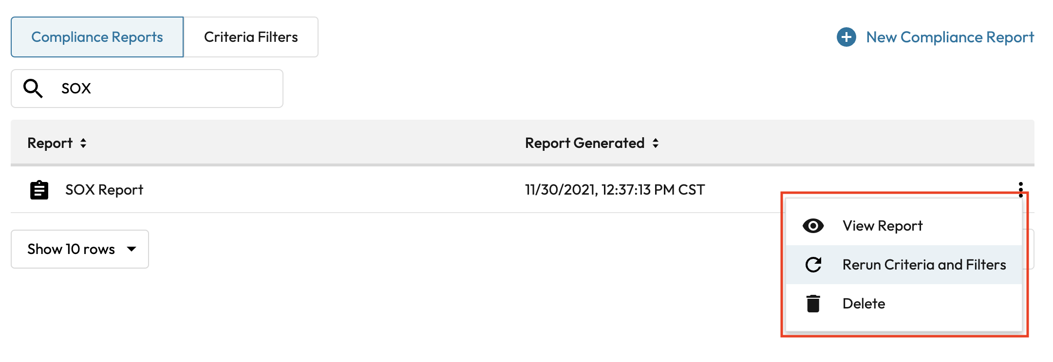 Saved reports can be viewed and rerun from the “Compliance Reports” tab. When re-running a report, the report criteria can be edited, and the new report criteria will be saved with the new report snapshot.
