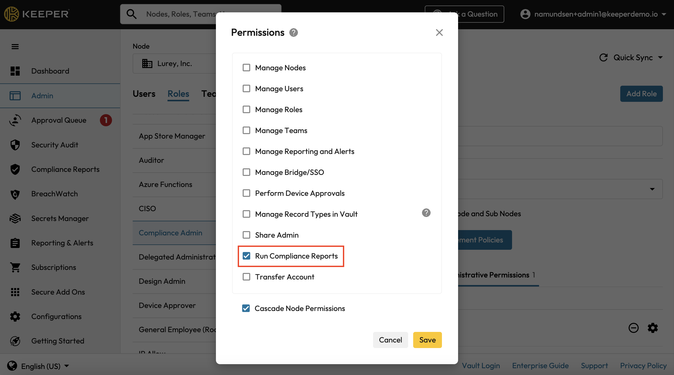 Once the Keeper Compliance Reports feature is activated through a trial or purchase, there will be a new administrator role permission in your Admin Permissions popup menu called “Run Compliance Reports”. Select this permission for administrator roles that will be authorized to create, view, and edit compliance reports.