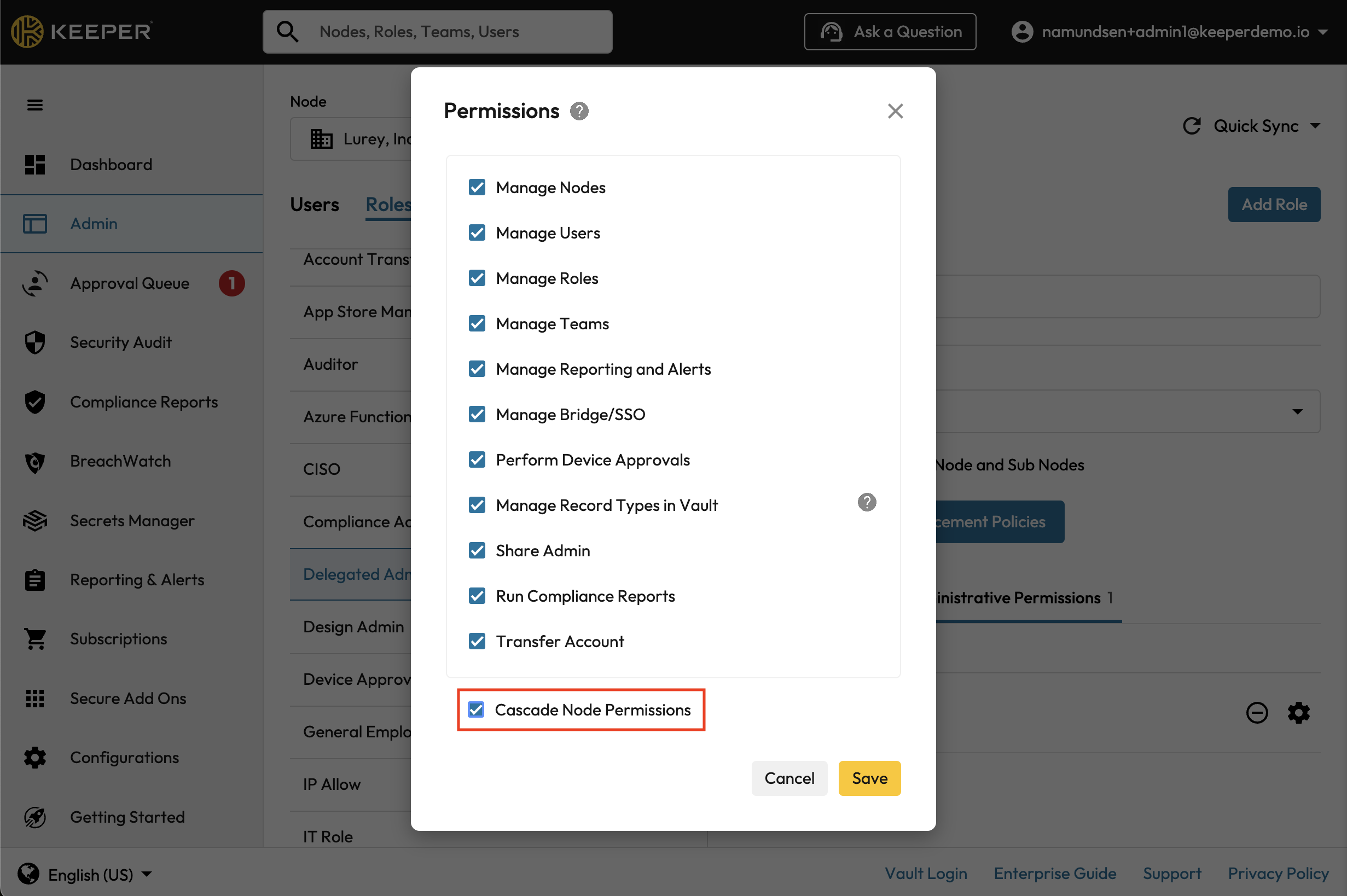 An example of a role that can be created would be a Delegated Admin role. In this role the administrator can set up one or more Administrative Permissions that allow that user in the role to login to the Keeper Admin Console and perform administrative functions. For example, the delegated admin can be given permission to create teams, add users, create or edit roles, run reports, approve devices and perform account transfers. These permissions can be limited to a single node or they can cascade or traverse down the tree structure to all the sub-nodes.