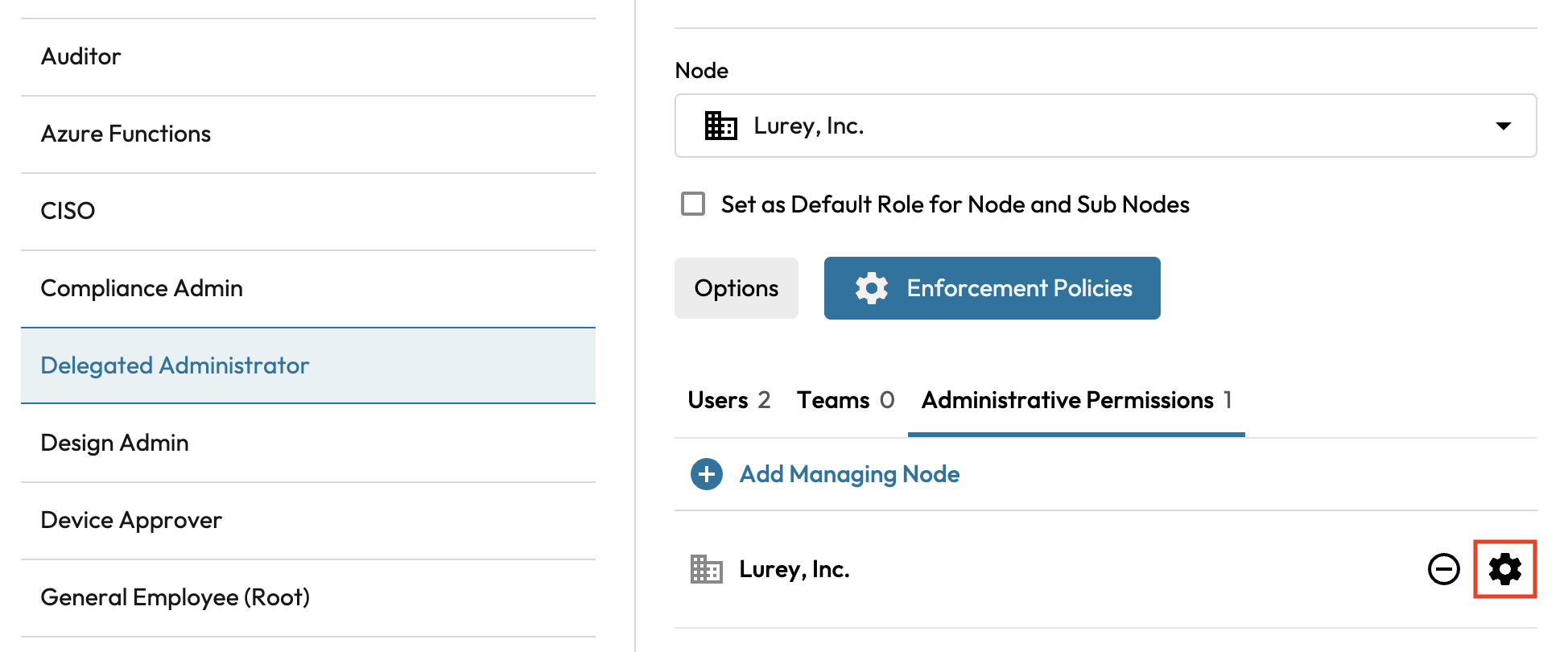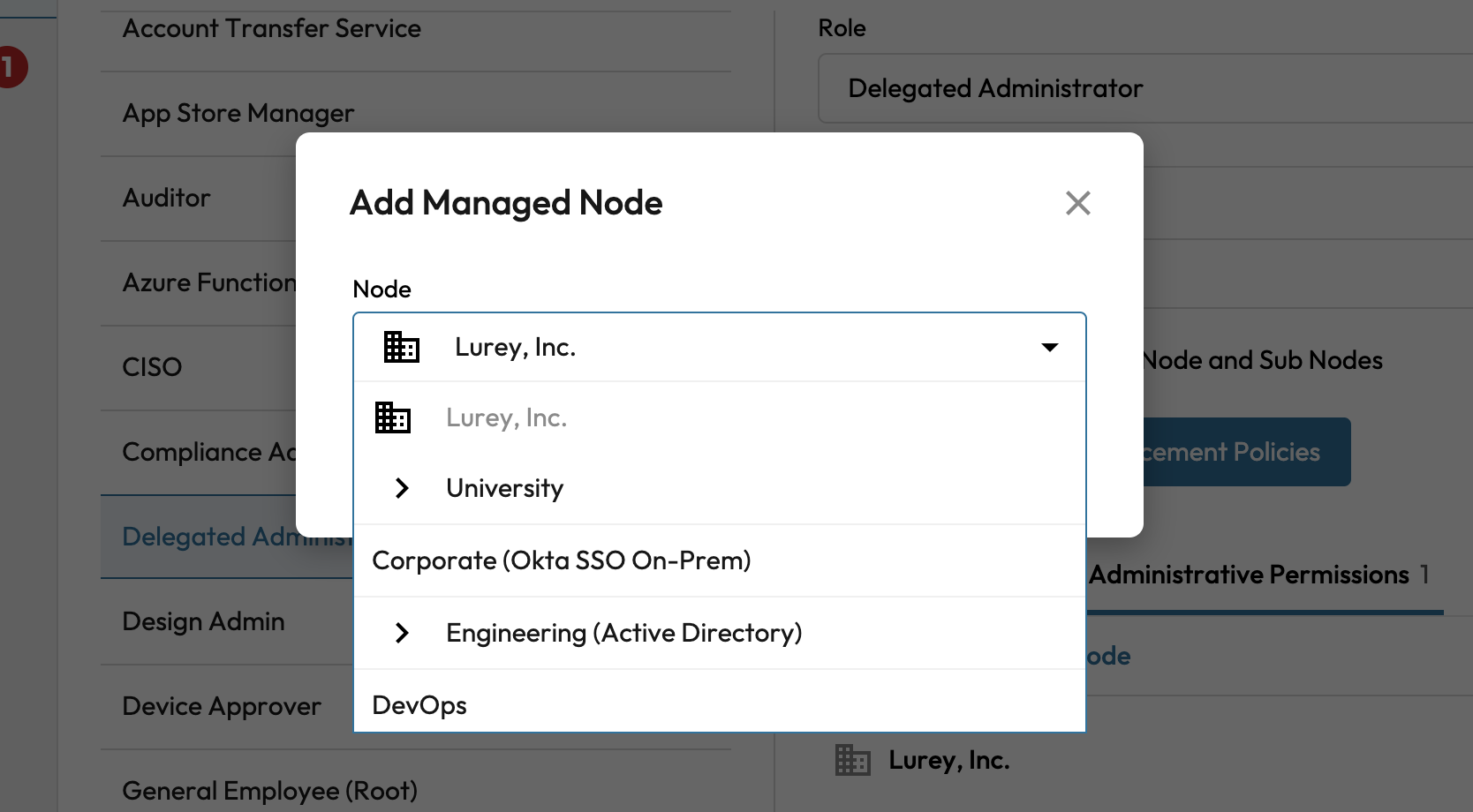 To give Administrative Permissions to a Role, select the + Add Managing Node button on the Role screen.