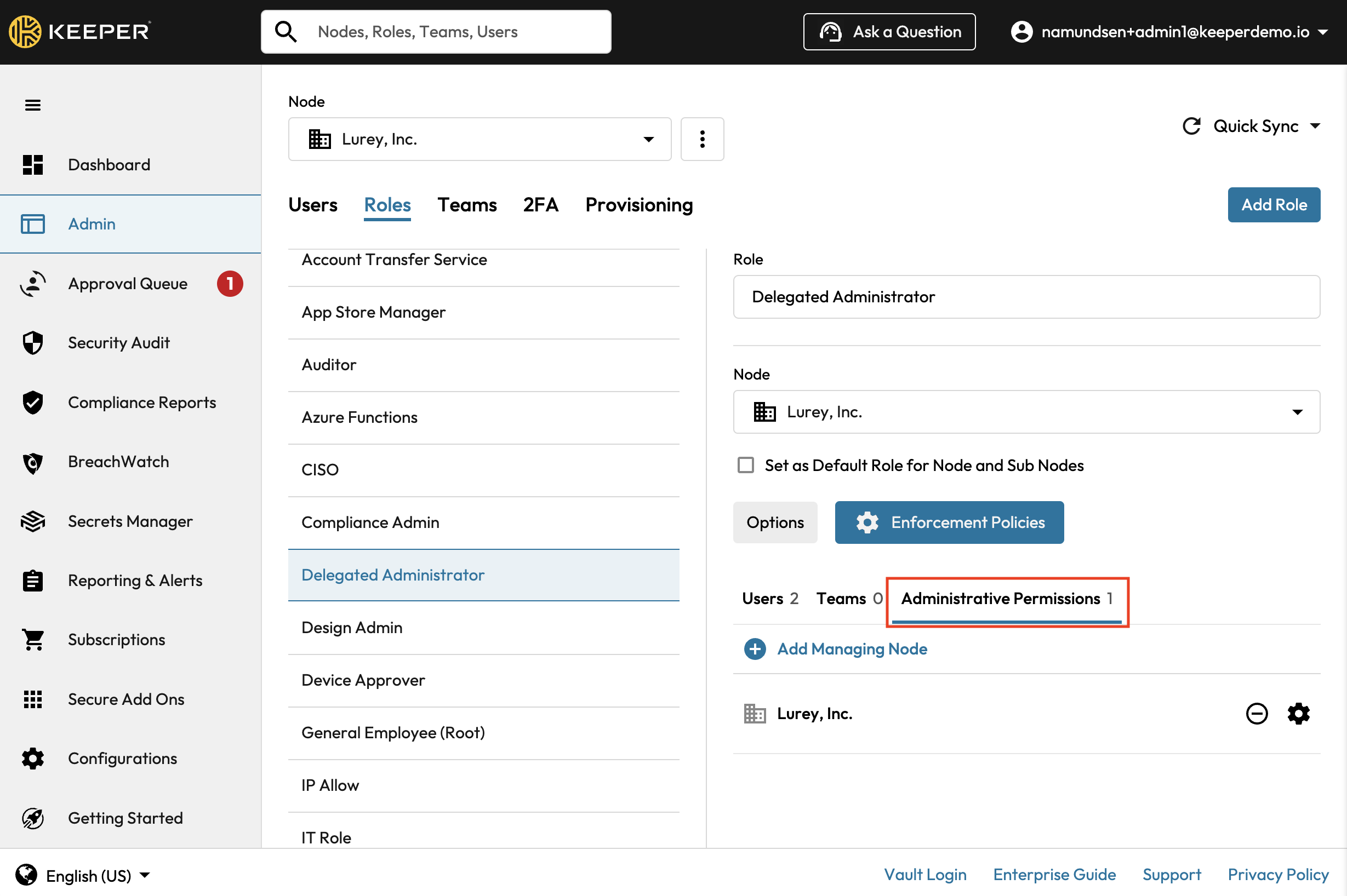 A Keeper role can be granted Administrative permissions over the node (or sub-nodes) for which a role exists. This delegated administration allows different roles to have different permissions inside of the Admin Console.