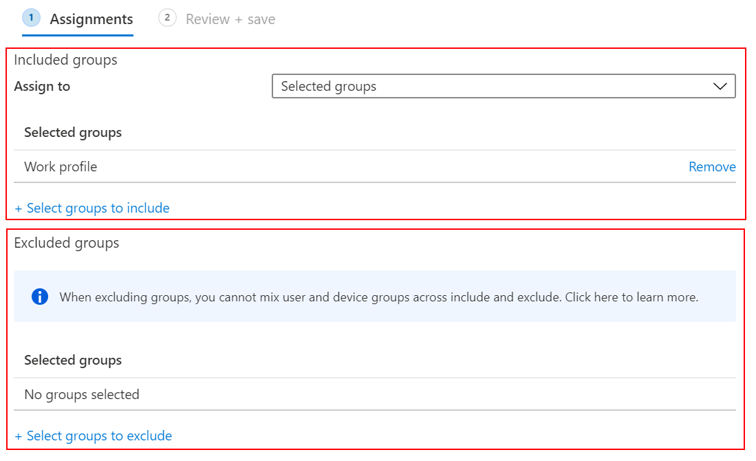 11. In Assignments, select the users or groups that will receive your profile. For more information on assigning profiles, see Assign user and device profiles.