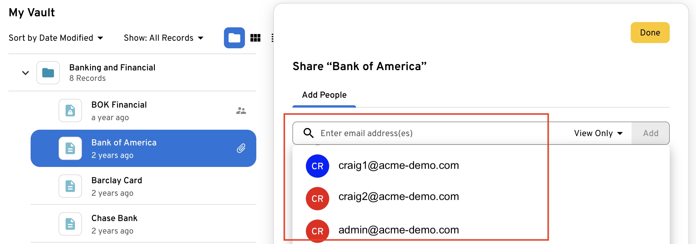 Node Isolation affects the ability for users to share records and folders outside of their node tree. For example, when sharing a record from the vault, the auto-suggestion list is restricted.
