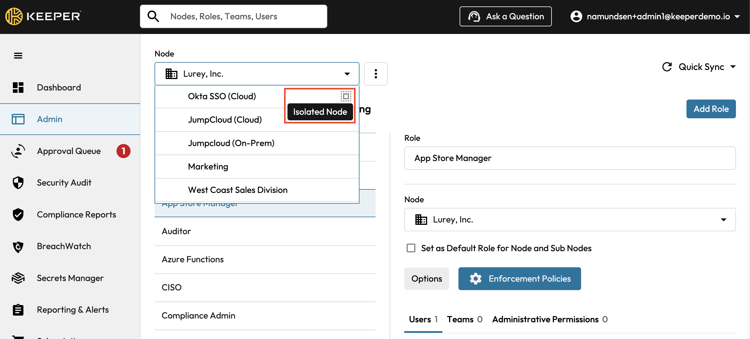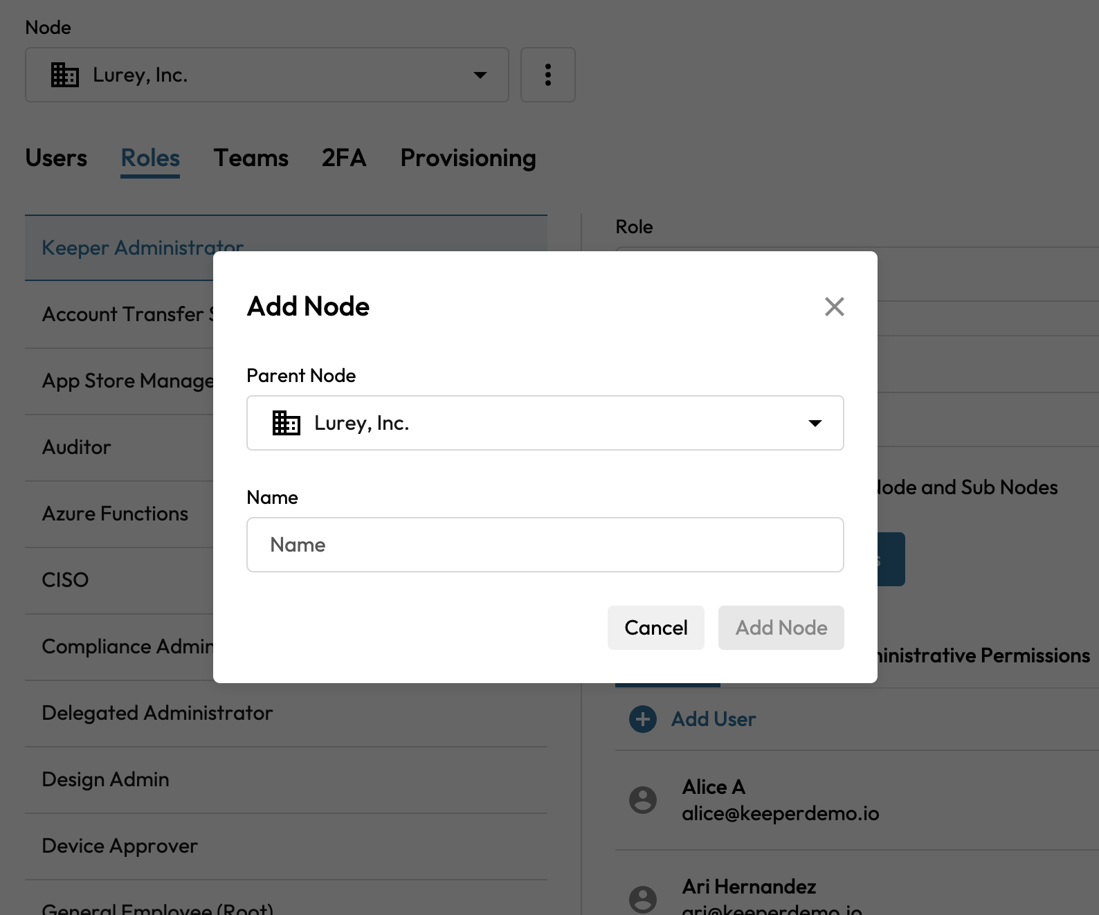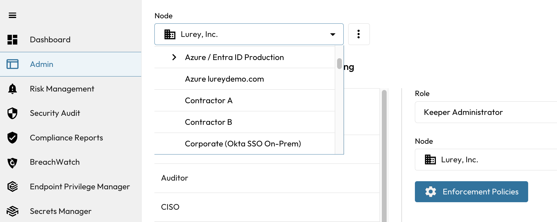 Keeper's "node" architecture provides customers with a way to organize users into distinct groupings, similar to organizational units in Active Directory. The administrator can create nodes based on location, department, division or any other structure. A node is typically associated with different provisioning methods and identity providers.