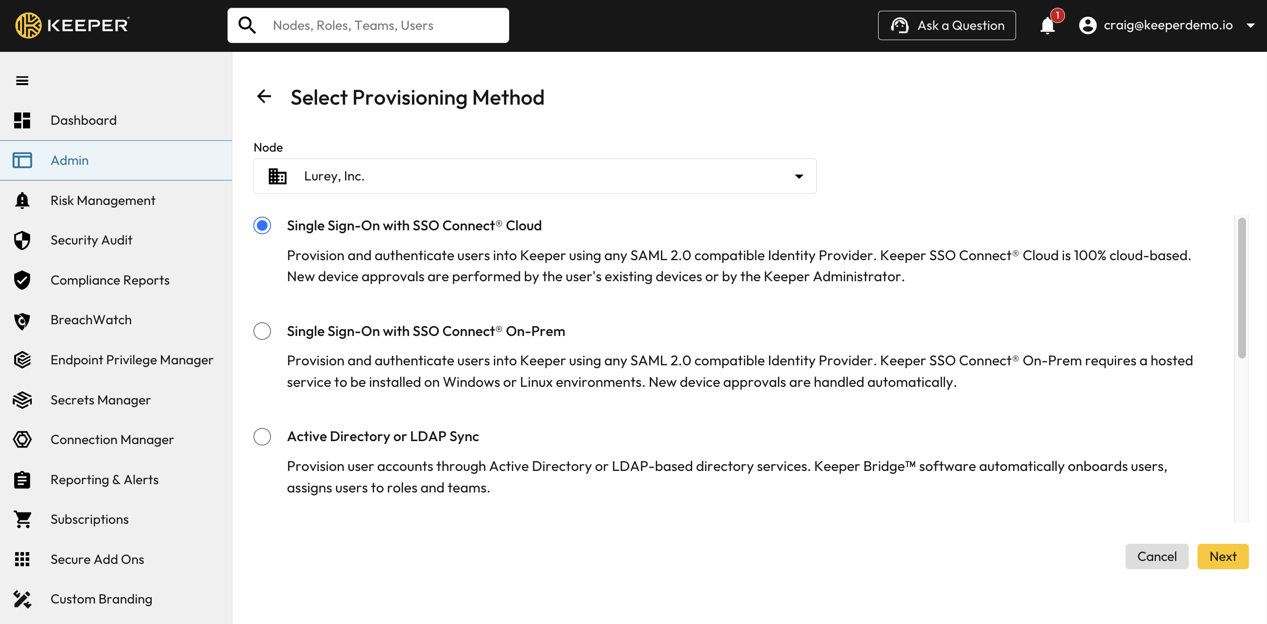 Each node and sub-node within the Keeper deployment can provision users with different provisioning methods. For example, Finance and Sales & Marketing can use Single Sign-On, and Engineering can use Active Directory.