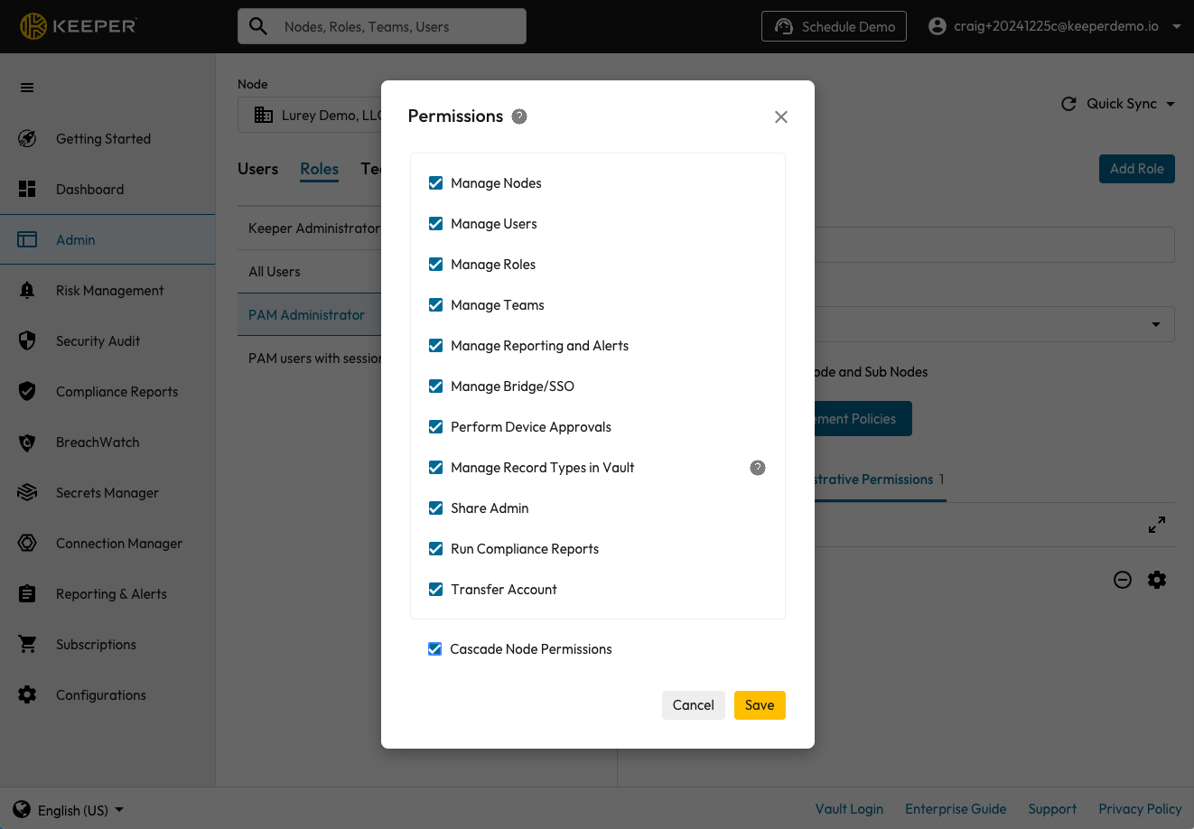 Larger organizations benefit from organizing locations or departments into multiple nodes. Users can then be provisioned under their respective node and have roles configured to match the specific needs of the business. One of the advantages in defining multiple nodes is to help support the concept of **delegated administration**. A delegated administrator can be granted some or all of the Administrative permissions but only on their respective node (or sub nodes) to help reduce the administration load on the primary Keeper Administrators.