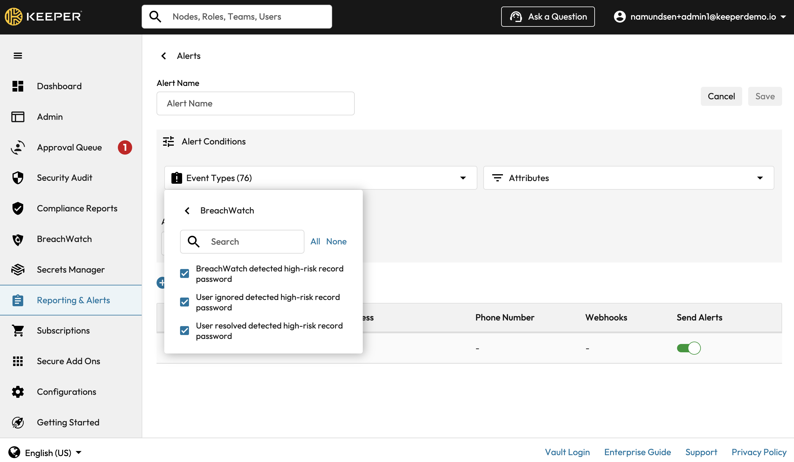 Keeper's Advanced Reporting System provides built-in Alerting capabilities that will notify users and Administrators for important events.  As a best practice, Keeper has created a list of recommended alerts that can be configured by the Keeper Administrator.
