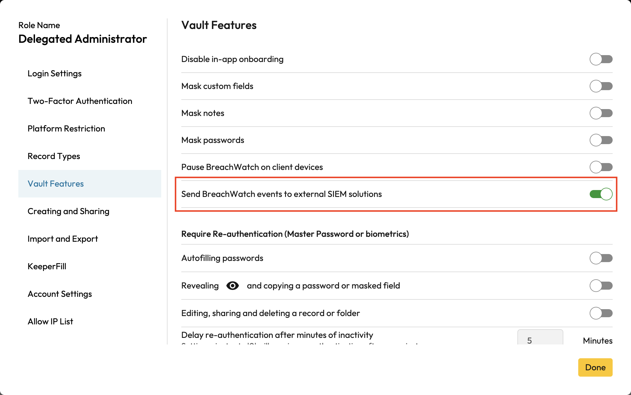 Go to the **Role** of the users affected by the policy > **Enforcement Policies** > **Vault Features** and turn the setting to ON.