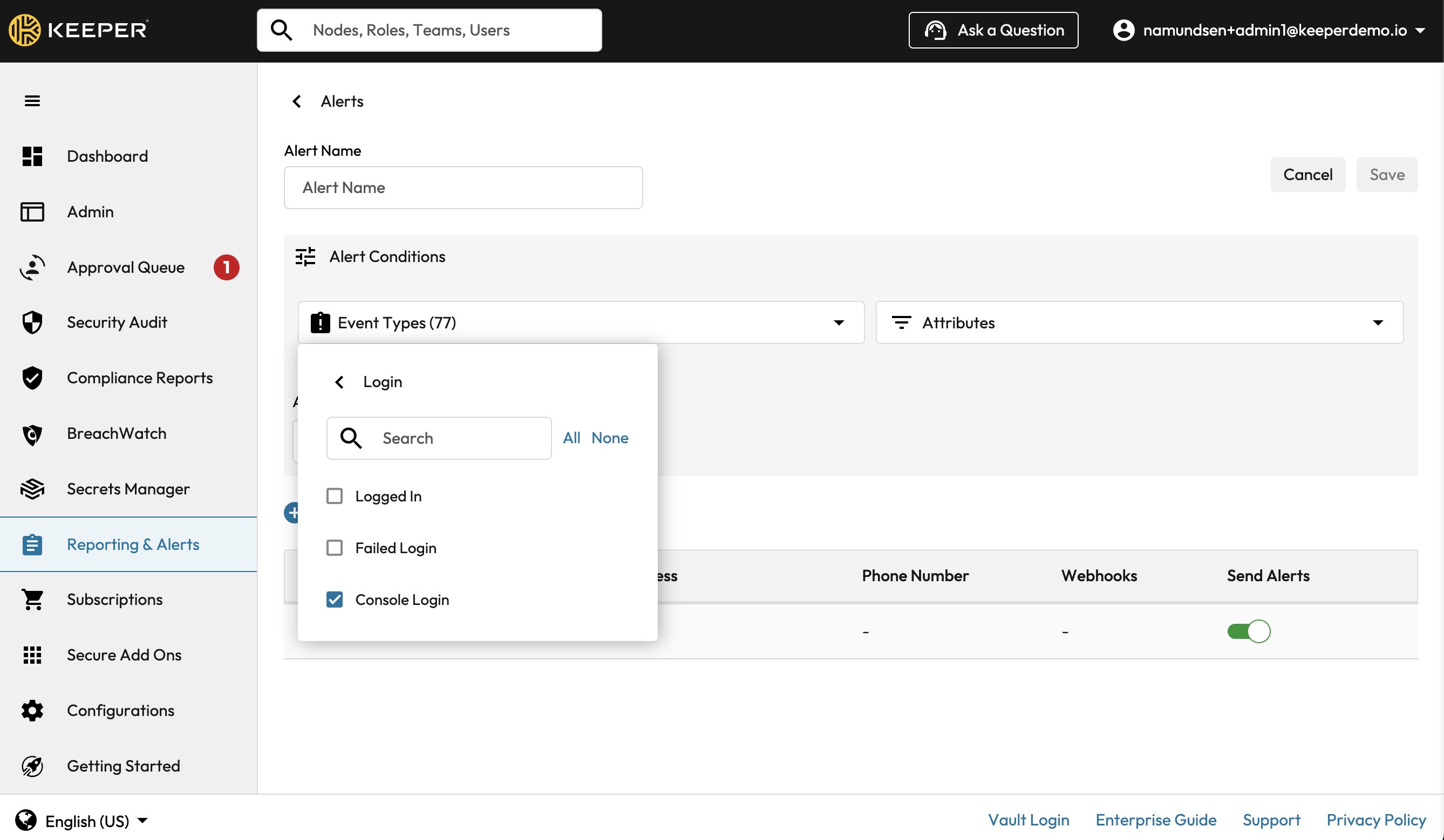 Depending how many Keeper Administrators you have in the organization, you may want to be alerted every time an Admin Console login occurs.