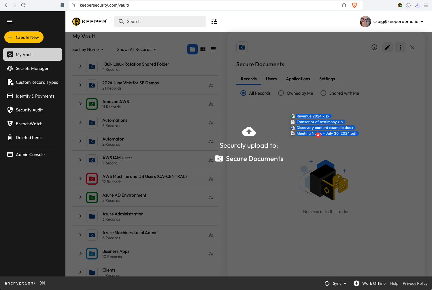 Simply drag-and-drop files into the Web Vault or Desktop App. Or on iOS/Android devices, you can load content from the local device. Files are then encrypted locally on the device and the ciphertext is stored in the Keeper Cloud Security Vault.