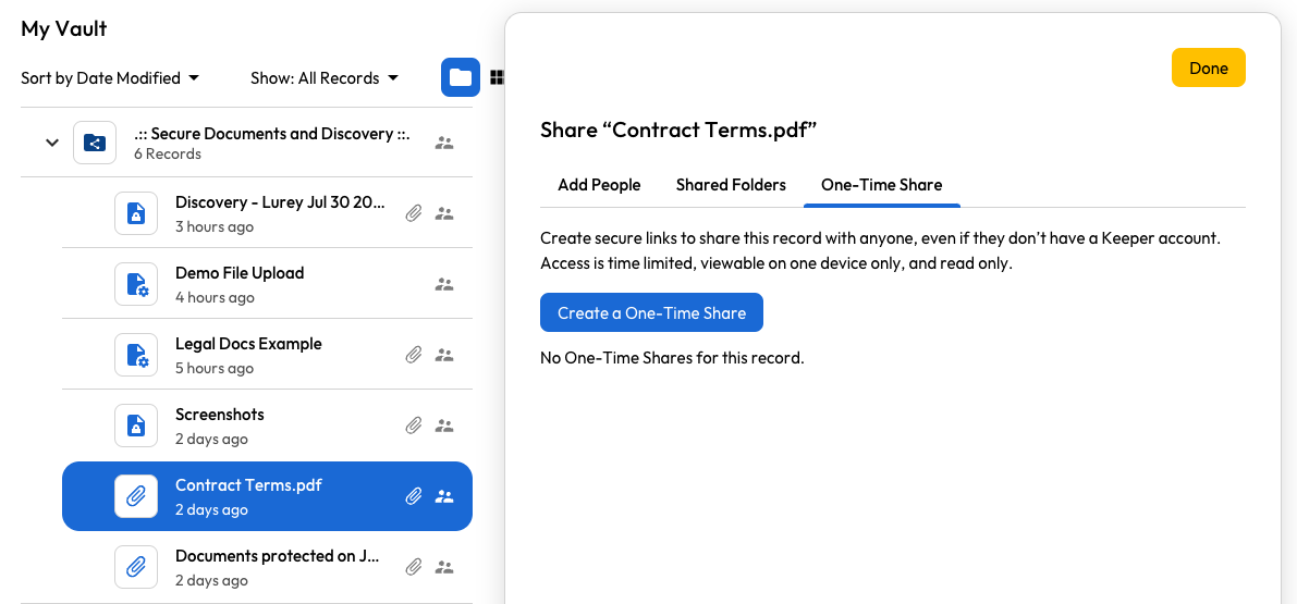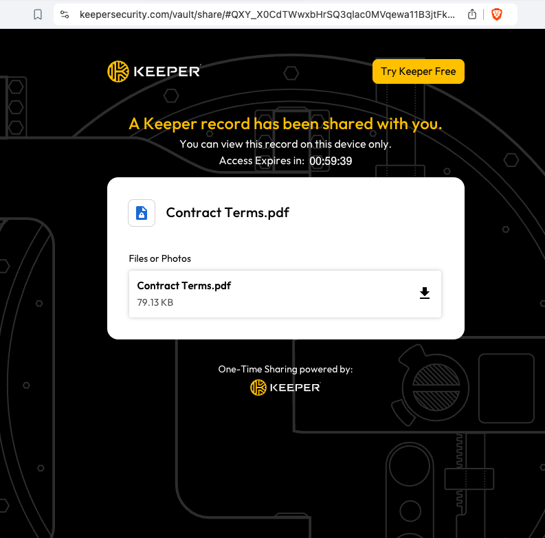 For more information about one-time shares, [see this page](https://docs.keeper.io/en/enterprise-guide/sharing/one-time-share).