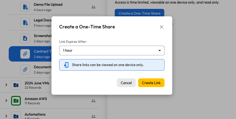 <figure><img src="https://4290574019-files.gitbook.io/~/files/v0/b/gitbook-x-prod.appspot.com/o/spaces%2F-LO5CAzpxoaEquZJBpYz%2Fuploads%2Fg5sO5mQYOqShYuEGXJkK%2FScreenshot%202024-08-01%20at%206.58.35%E2%80%AFPM.png?alt=media&#x26;token=c19ab9cd-1bc1-4580-bdb0-7e8057ddc1cc" alt=""><figcaption><p>Create a One-Time Share Link</p></figcaption></figure>