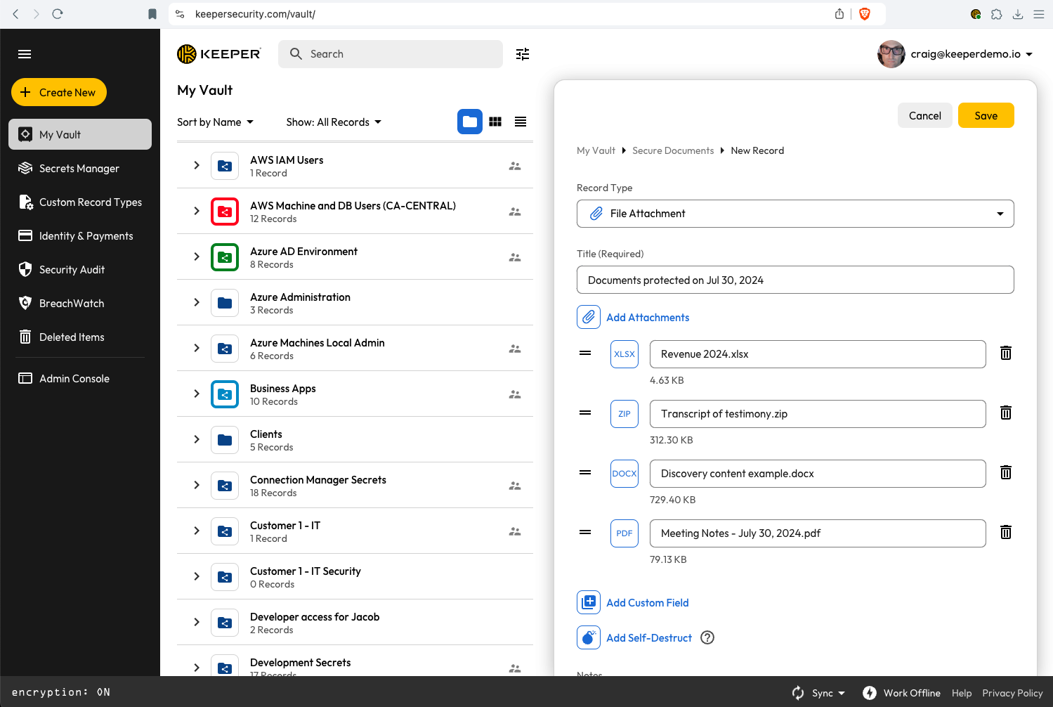 File attachments are end-to-end encrypted. The encryption is performed locally on the user's device before being uploaded to the Keeper Cloud Security Vault. The user is in complete control of the encryption keys to access and decrypt the files for complete privacy and security. Users also have the ability to securely share files with other Keeper users via shared folders, individual record sharing and one-time share. Sharing records uses Elliptic Curve encryption, making Secure File Storage the best way to save, transfer and share the most sensitive documents.