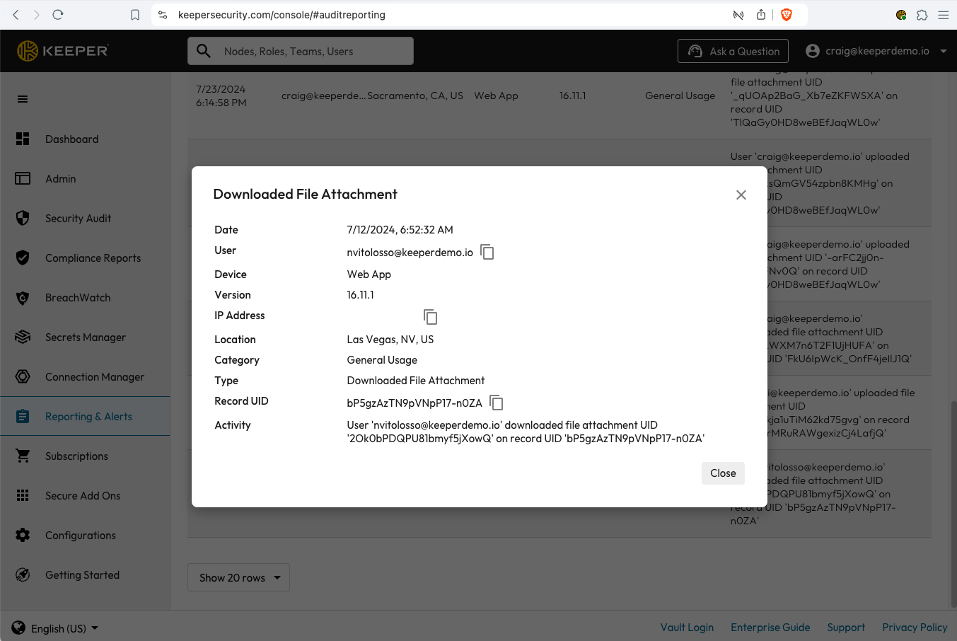 All file related actions such as uploading a file, downloading a file or sharing a record is tracked and monitored through Keeper's advanced reporting and alerts module. This provides event-based reporting that contains information such as: the user's IP address, location, software version, the record identifier, file identifier and other metadata.