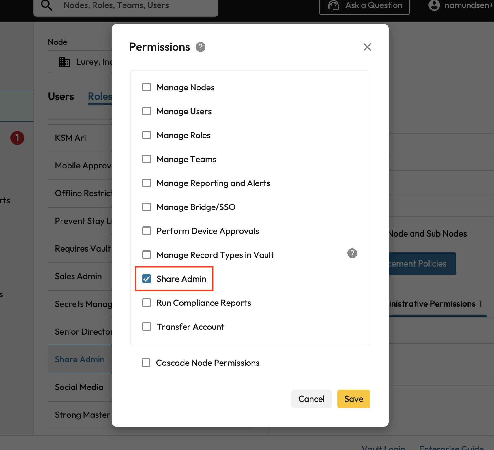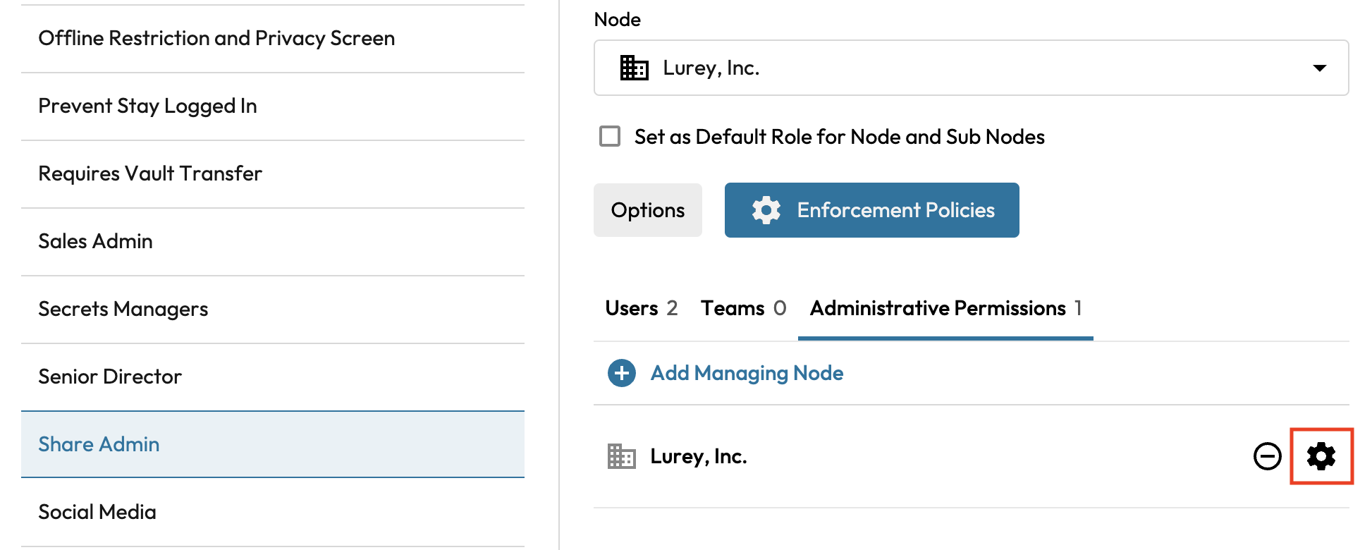 To assign someone in your organization Share Admin permissions, first create a role or select an existing role. Under administrative permissions click on the gear icon to display the list of permissions and select “Share Admin”.