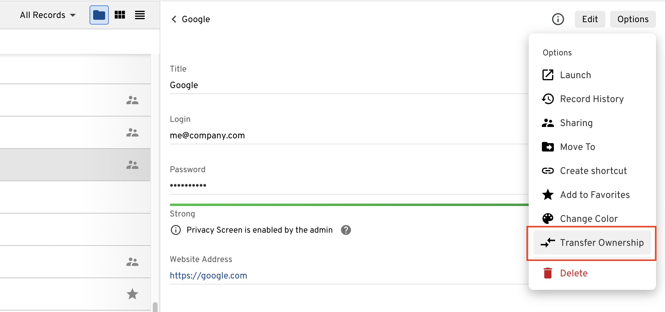 The transfer is verified if successful, if not, you will receive a notification of any records that are unable to be transferred. Share Admins can also perform a transfer of ownership of a single record directly from the record’s “Options” menu.