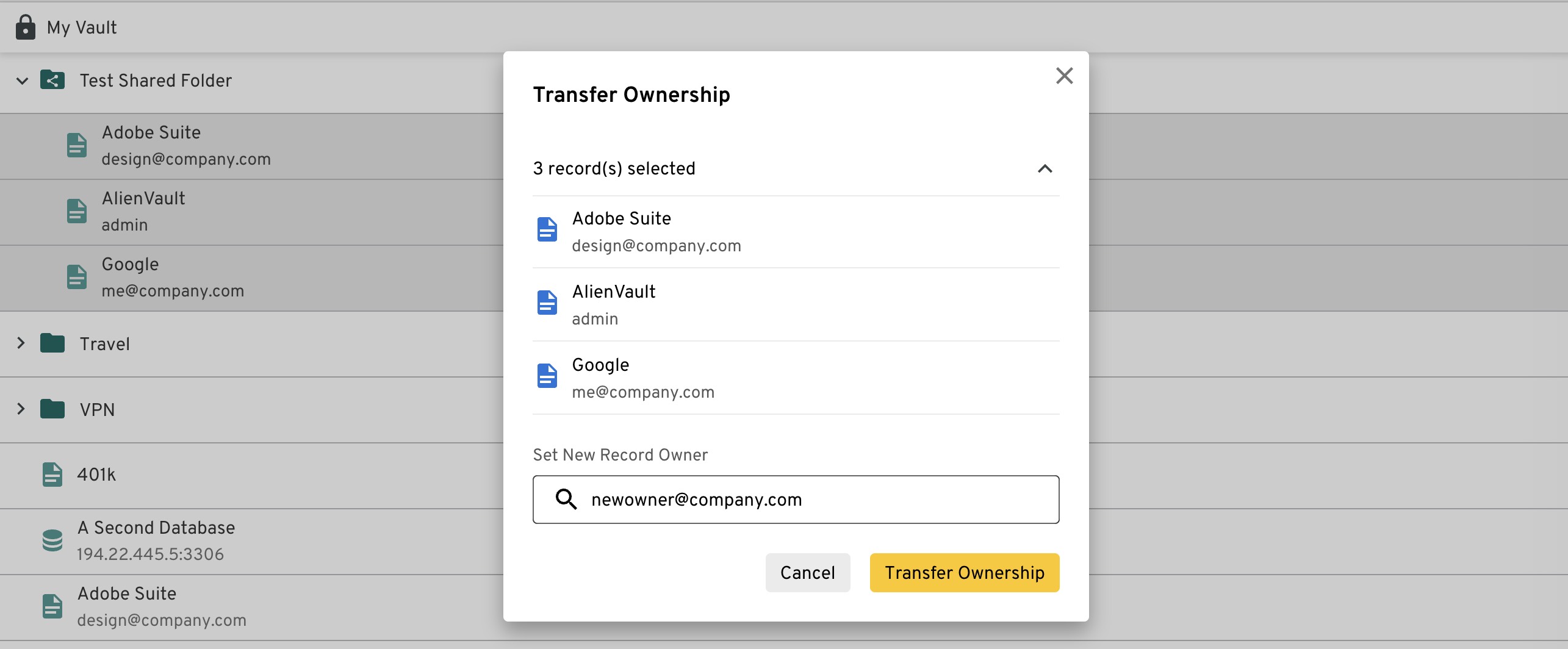 Share Admins have full record edit permissions including the right to transfer ownership of single or multiple records at once. To transfer ownership of multiple records, select the records, then right-click to reveal the context menu and select transfer ownership.