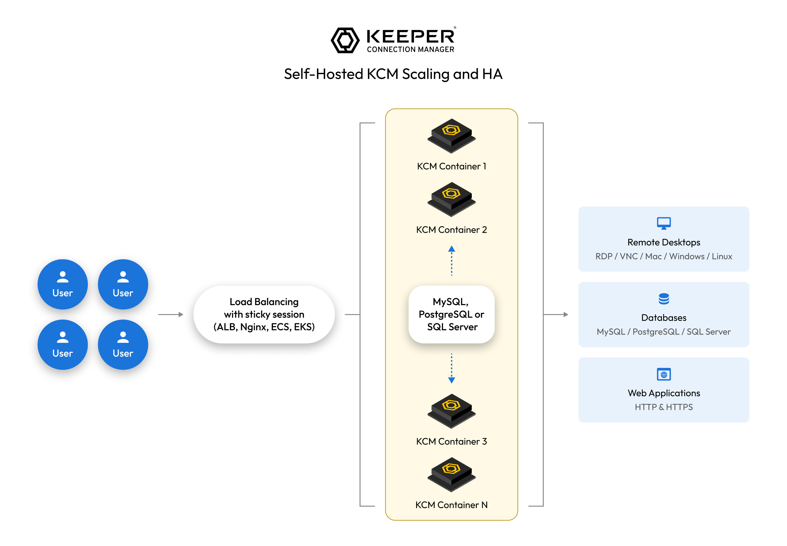 Below is a high-level overview of setting up Keeper Connection Manager (KCM) for High Availability (HA). This is an advanced implementation that requires familiarity with load balancing, databases, security groups, VPCs, etc.