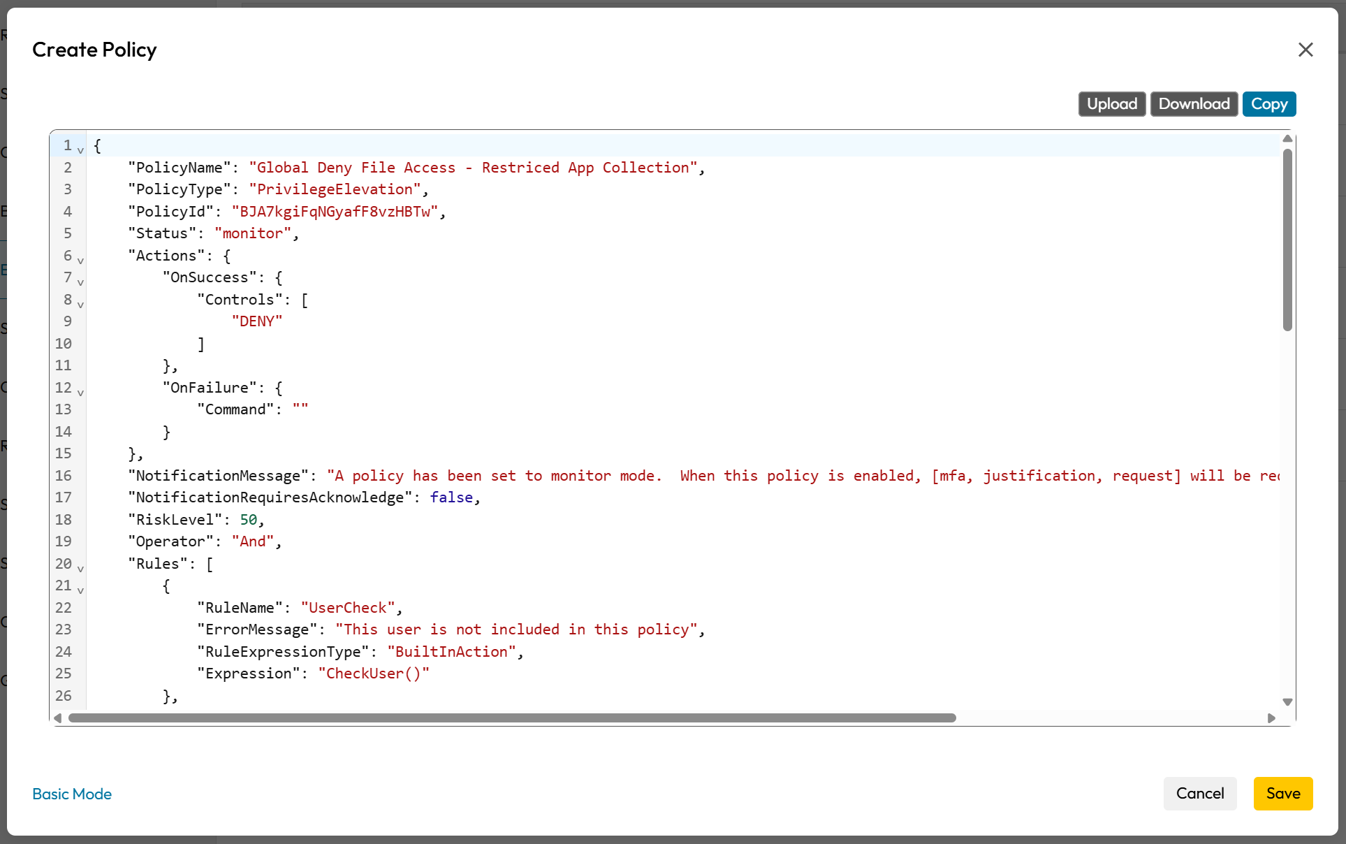 **Approve Controls** & **Deny Controls** are specified within the JSON form which is accessible by clicking on the <mark style="color:blue;">**Advanced Mode**</mark> link, located in the bottom left corner of the Create Policy.  This will toggle the Advanced form, which will allow you to view and edit the JSON structure of your new **Global Deny File Access Policy.**