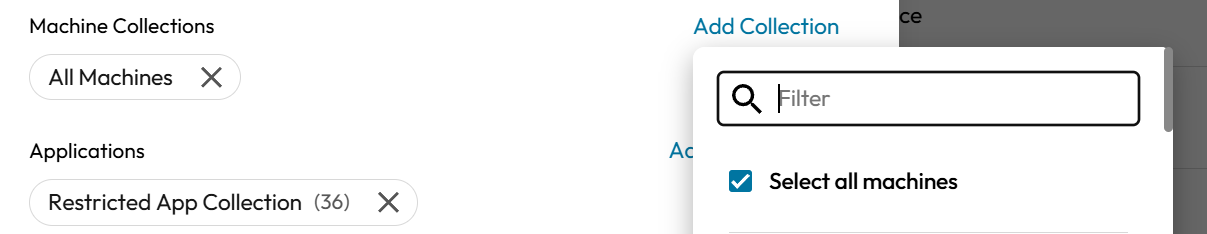 Click the <mark style="color:blue;">**Add Collection**</mark> link in the Create Policy form to the right of **Machine Collections**. This will open the **Add Collection** sub-form. Select the **Machine Collection** that you want to apply to your **LOTL Justification File Access Policy.** You may use the filter-as-you-type box to narrow your search for your Machine Collection.