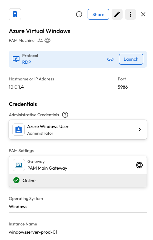 When sharing a PAM Machine record, the linked admin credentials will **not** be shared. For example, if the PAM Machine is configured with an Azure Virtual Machine, the recipient can connect to the Azure Virtual Machine on the PAM Machine record without having direct access to the linked credentials.