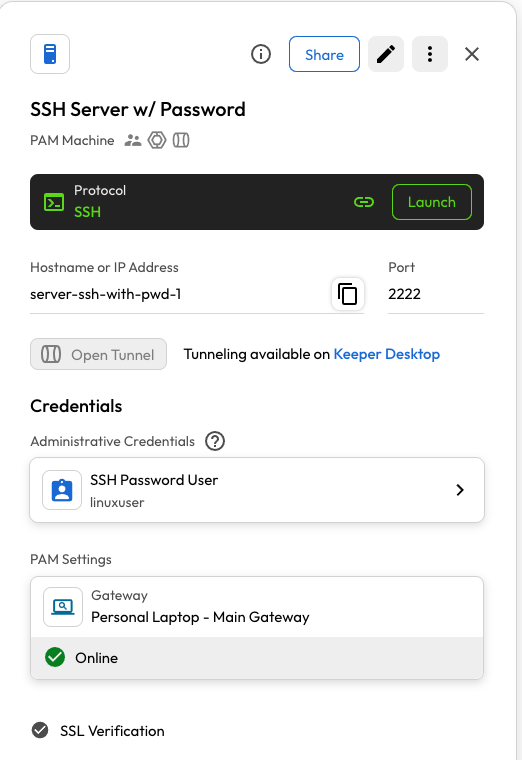 After completing the above, you can launch zero-trust connections to the Linux Machine directly from your Keeper Vault.