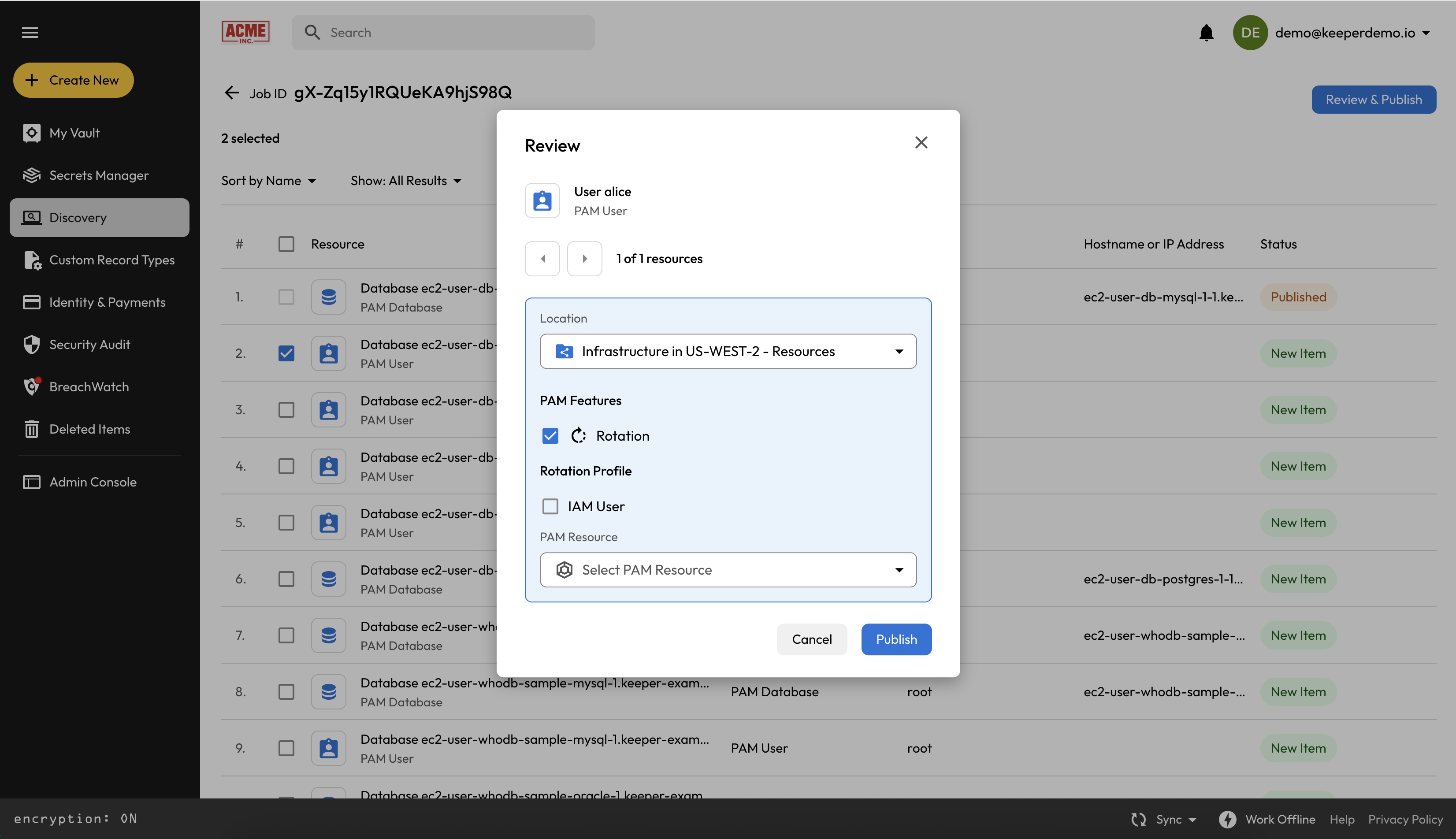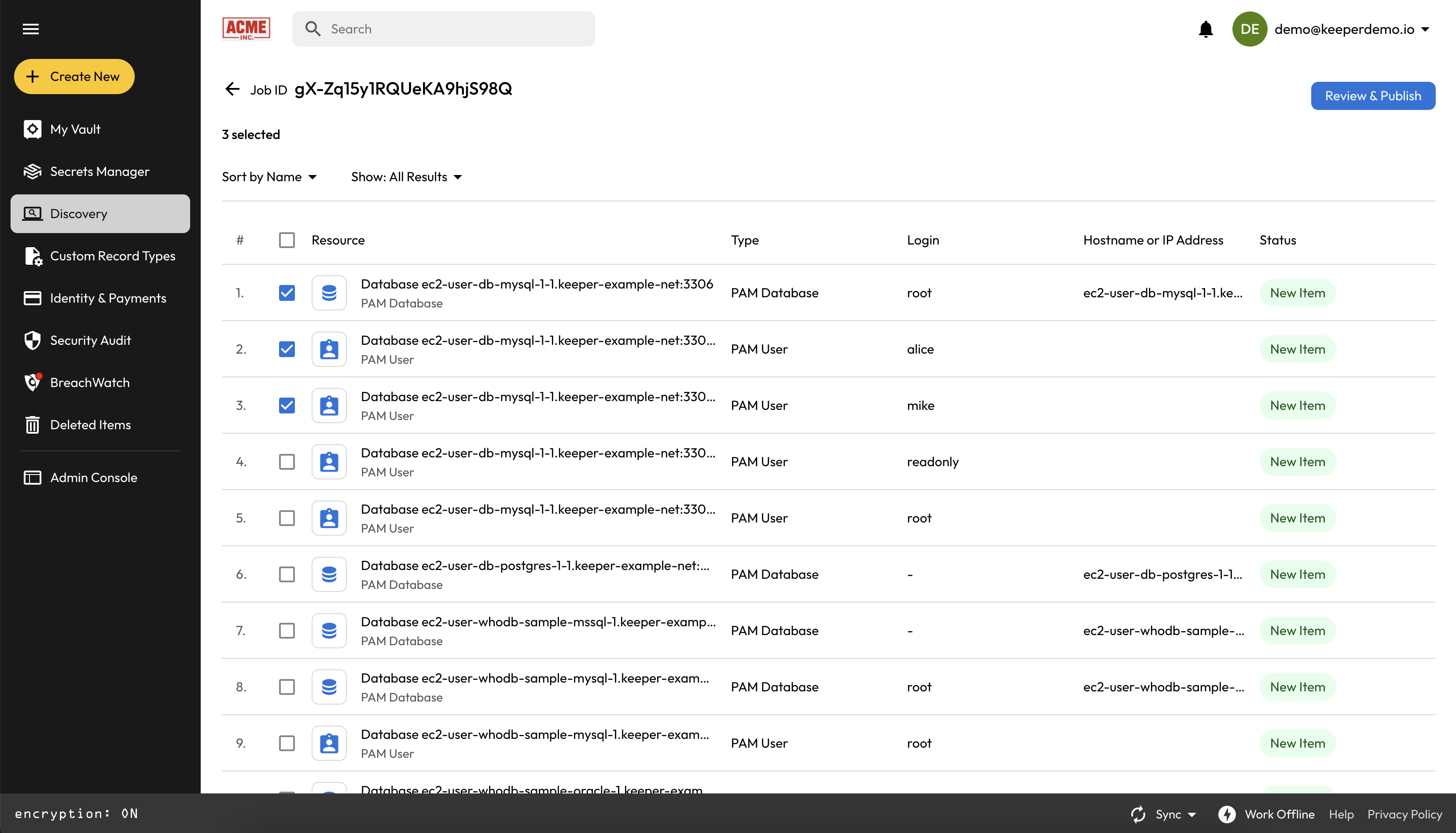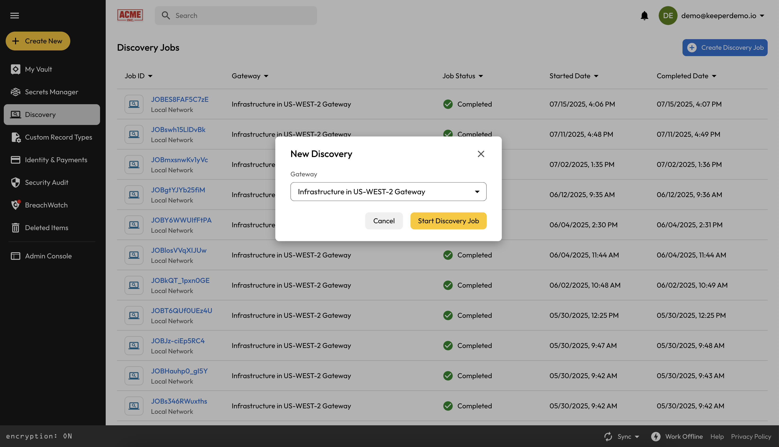 **Keeper Discovery** provides DevOps, IT Security, and development teams with centralized visibility into privileged accounts and IT assets across local, AWS, and Azure environments. Integrated through the Keeper Gateway, it helps organizations identify unmanaged accounts, misconfigurations, and security risks. By automating asset discovery and delivering actionable insights, Keeper Discovery strengthens security, streamlines operations, and supports compliance across complex infrastructure setups.