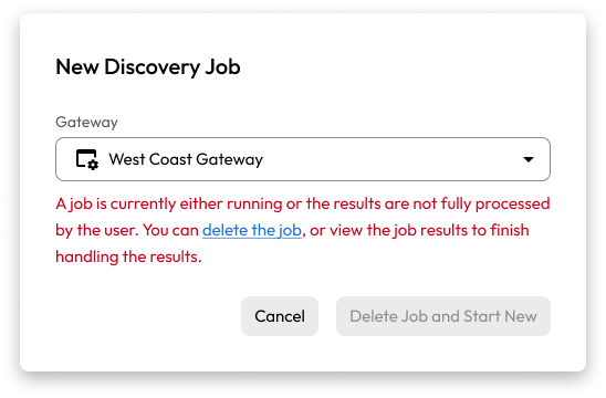 Discovery jobs can be run in parallel across Keeper Gateways, but a single gateway can only run a single job at a time. If a job on a particular gateway is still running, you will receive an error message and you are giving the opportunity to cancel the job.