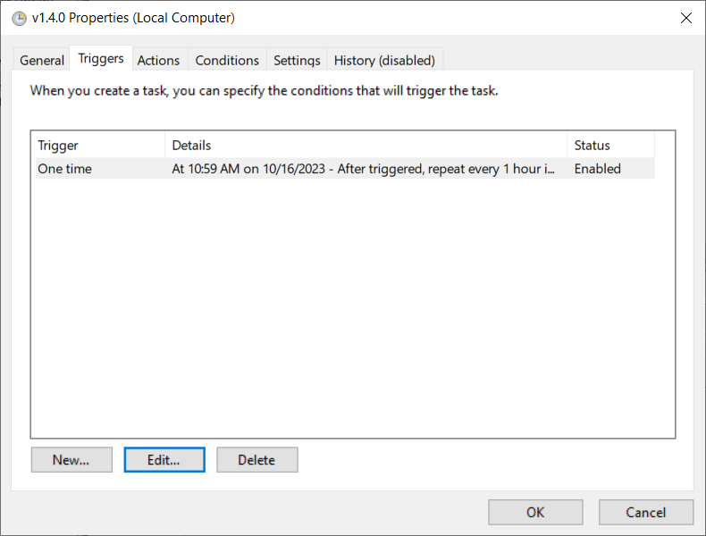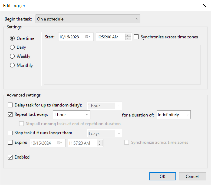 * Click `Edit...` to change when the Auto Updater checks for a new update to install. The default is to "Repeat task every 1 hour indefinitely" as shown below.