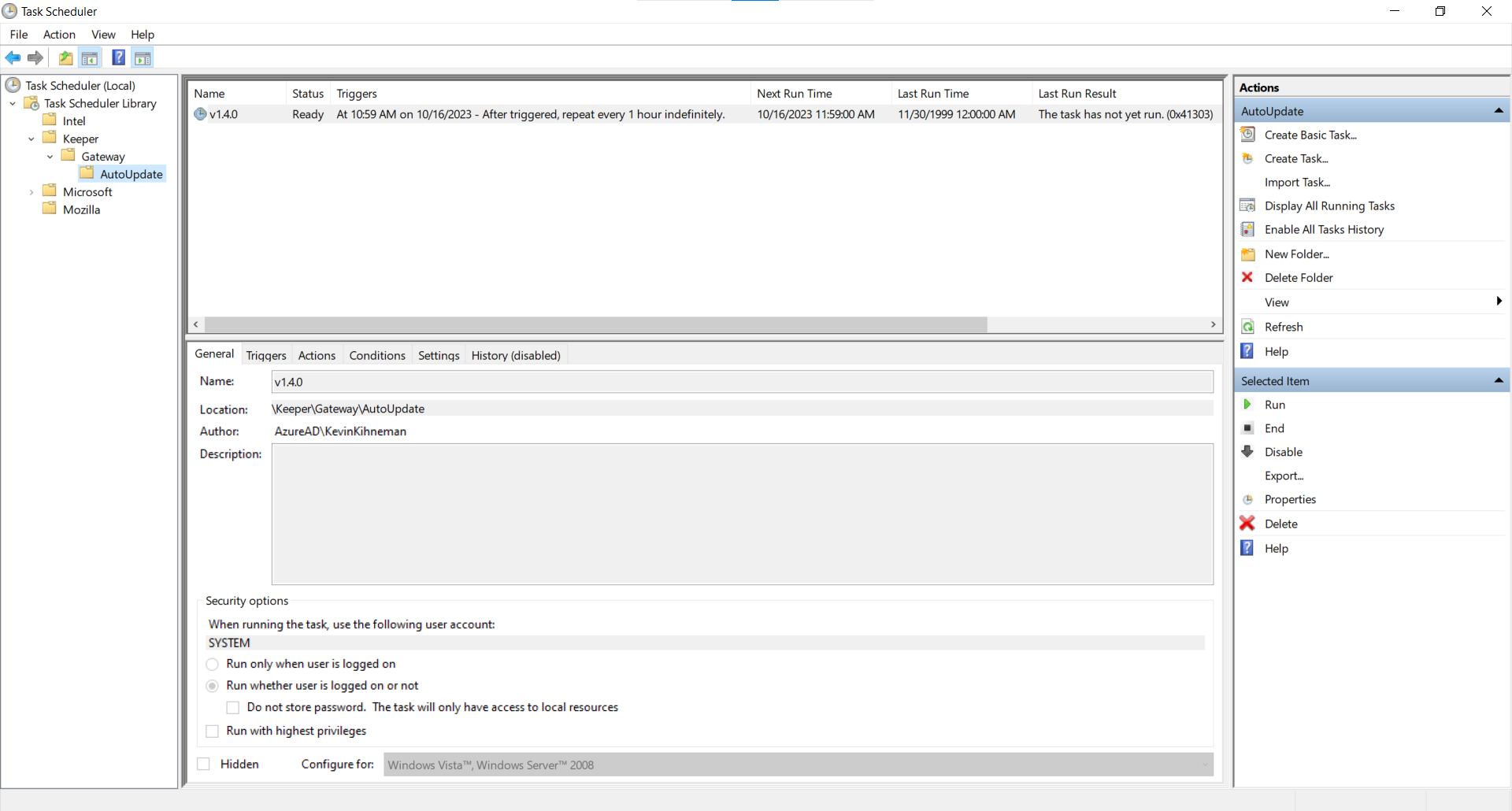 * In the left pane double-click on Task Scheduler Library -> Keeper -> Gateway -> AutoUpdate to show the Auto Updater Task.