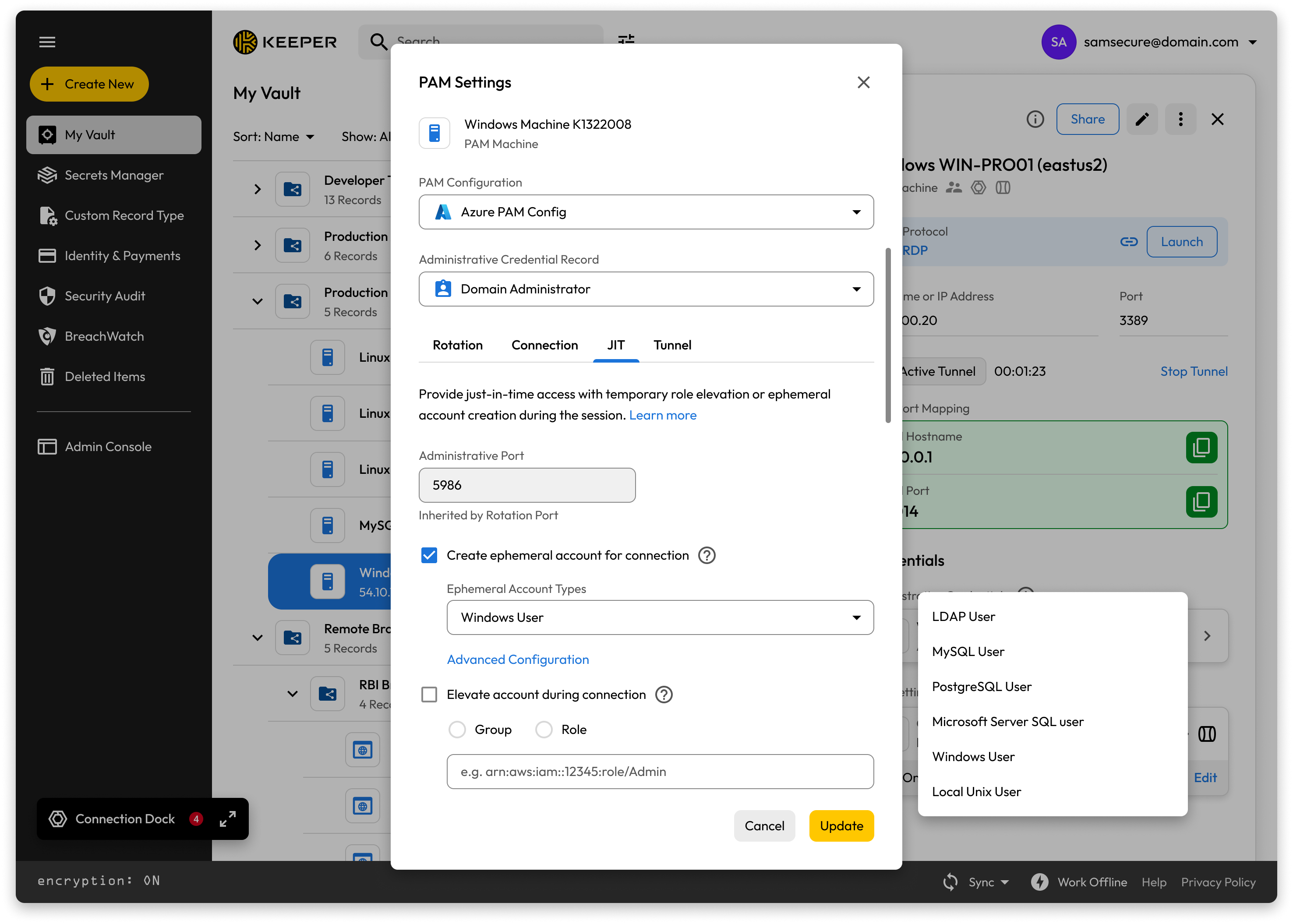 KeeperPAM can create temporary accounts with appropriate privileges that exist only for the duration of a privileged session.