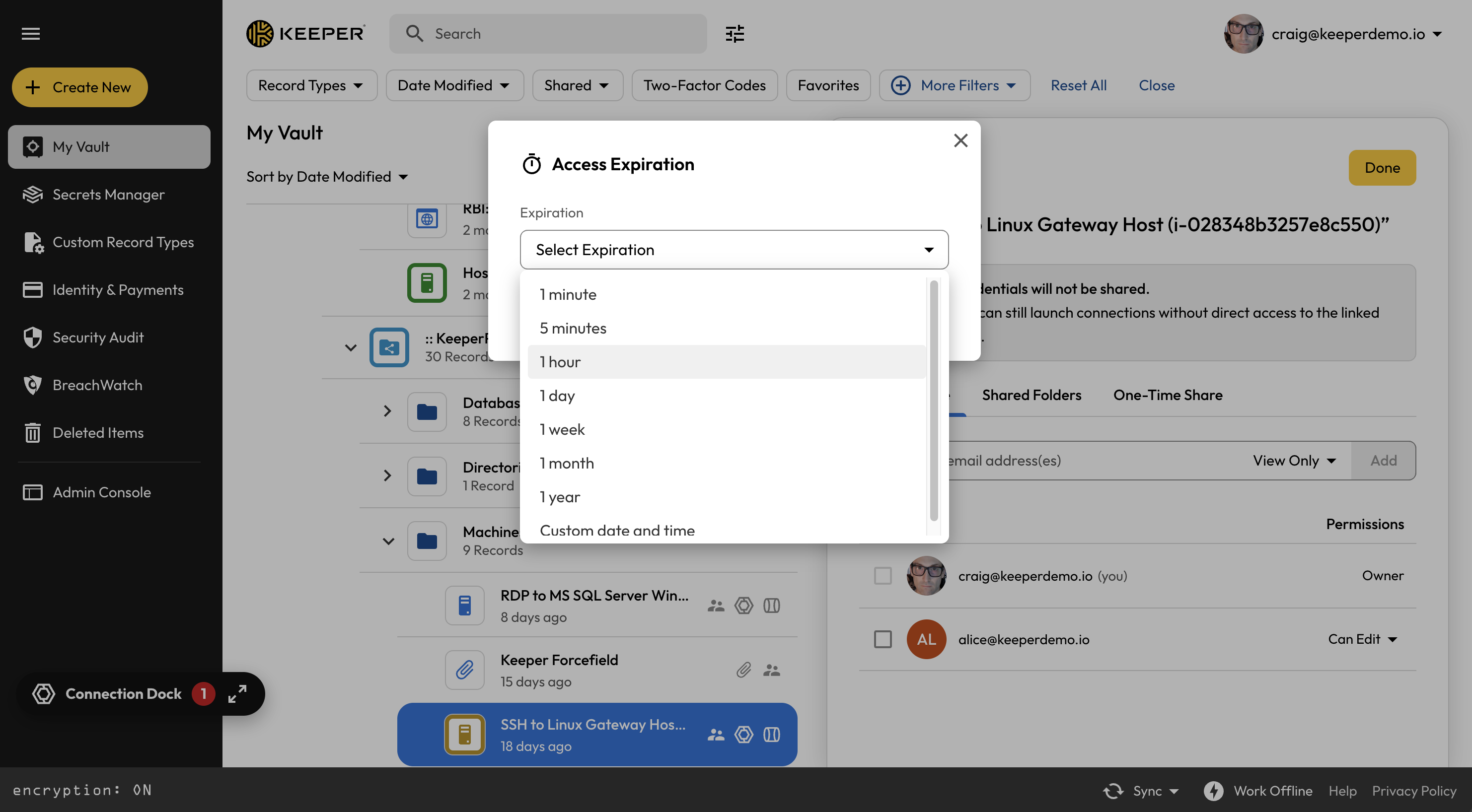 To provide time-limited access to a resource, open the resource from the vault and select **Sharing**. Add the user as a share recipient, and select **Set Expiration**.
