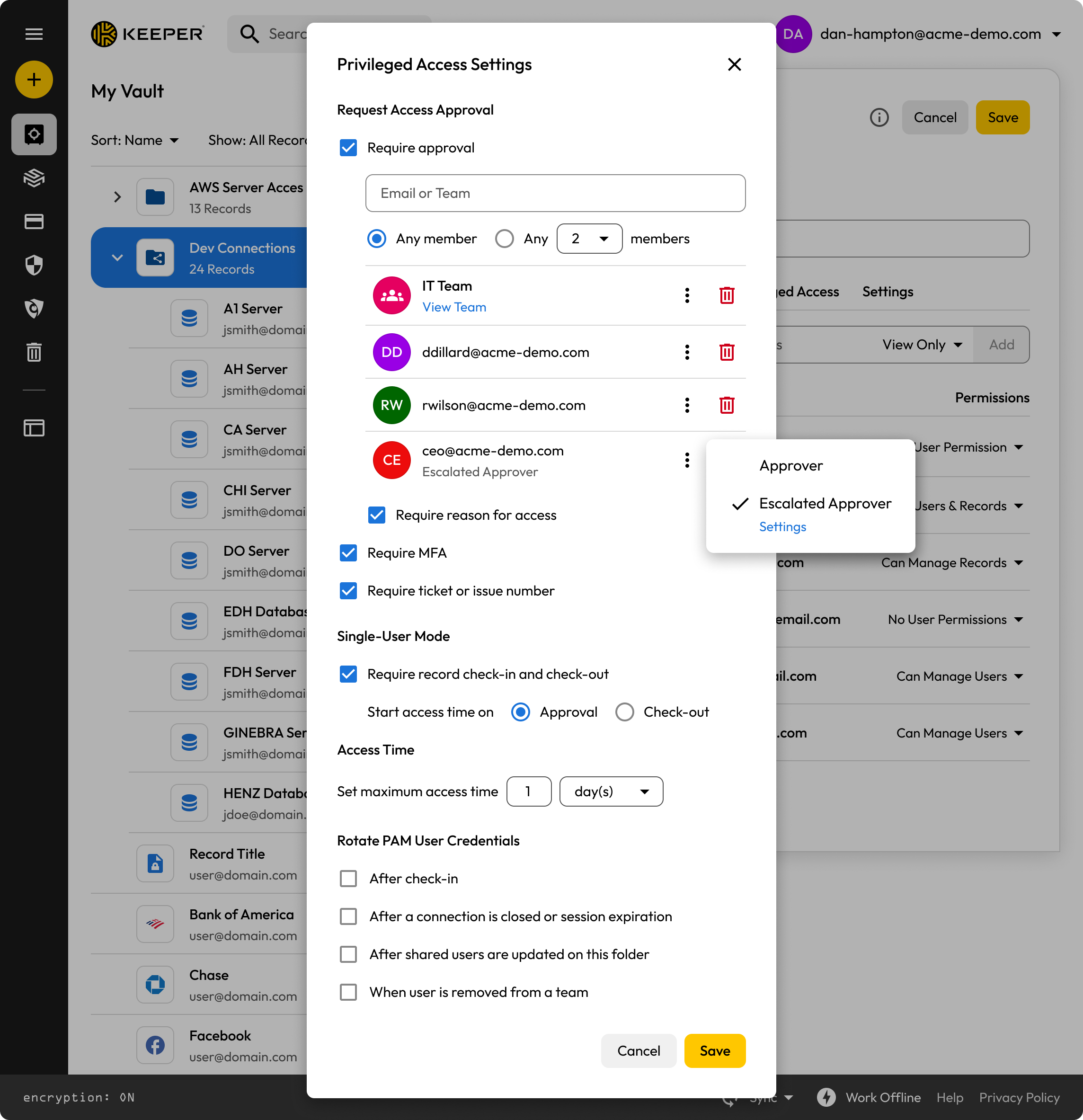 KeeperPAM includes flexible approval workflows for JIT access requests, ensuring proper oversight of privileged access.