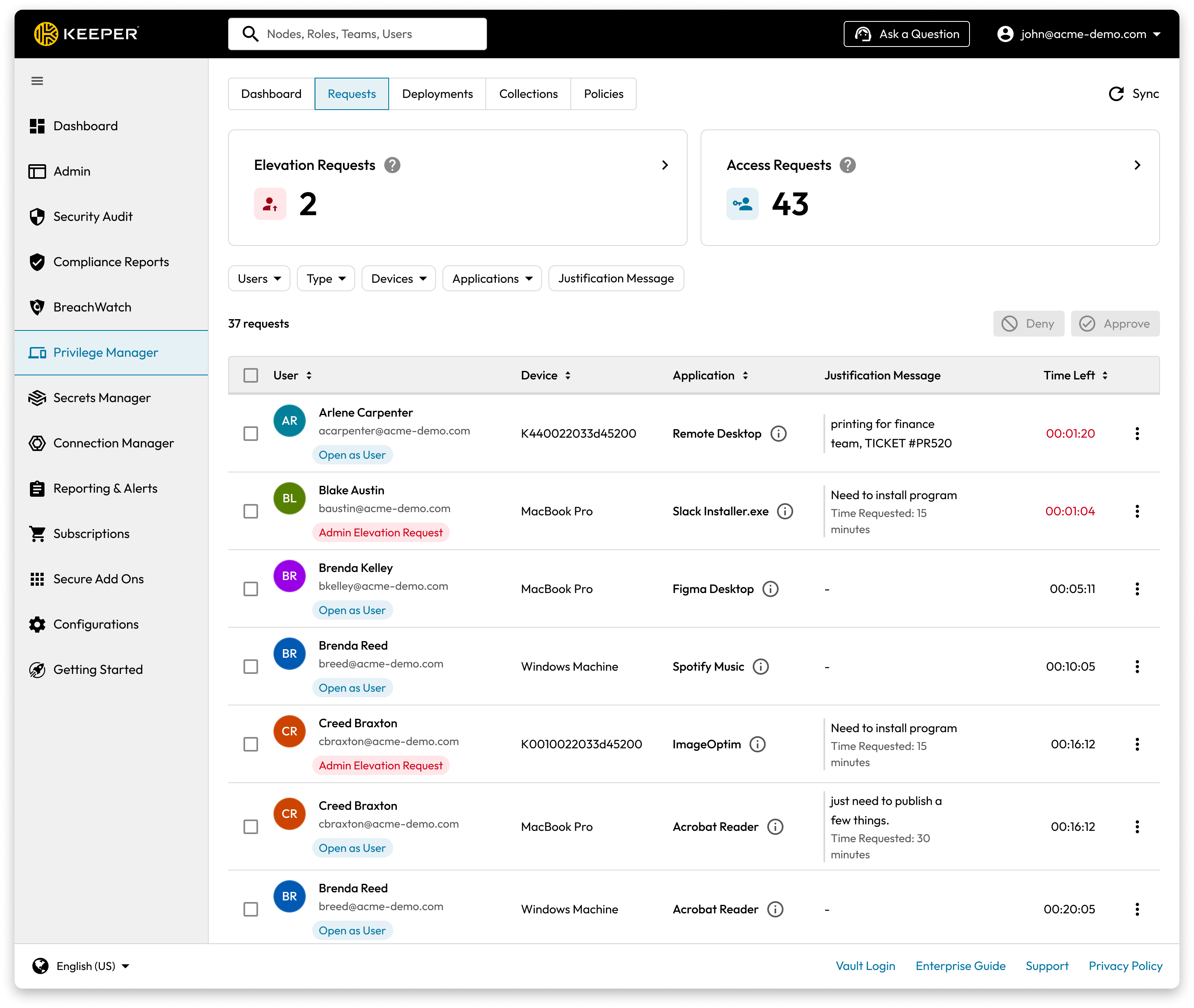 <figure><img src="https://762006384-files.gitbook.io/~/files/v0/b/gitbook-x-prod.appspot.com/o/spaces%2F-MJXOXEifAmpyvNVL1to%2Fuploads%2FtT2ZNiogZn4kZ9tGexxp%2FRequests.png?alt=media&#x26;token=82c4148a-83b4-49e9-8716-502fe89884eb" alt=""><figcaption><p>Just-In-Time Access with Keeper Privilege Manager</p></figcaption></figure>