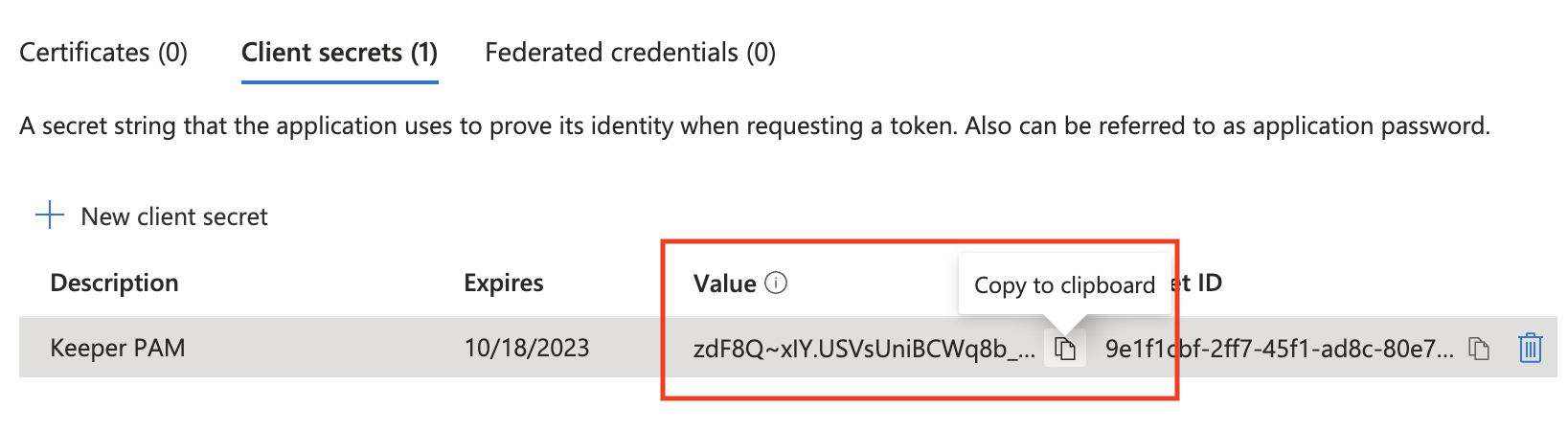 The page will refresh showing the secret **Value**. Copy the **Value** (not Secret ID) into the Keeper PAM Configuration "Client Secret" field. Save this value for later.