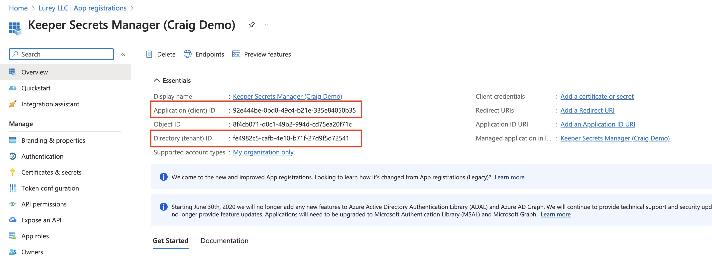 In the **Overview** of the application, the **Application (client) ID** UUID is shown. This is the **Client Id** field of the Keeper PAM Configuration record. The **Directory (tenant) ID** is also shown. This is the **Tenant Id** field of the Keeper PAM Configuration record. Save these values for later.