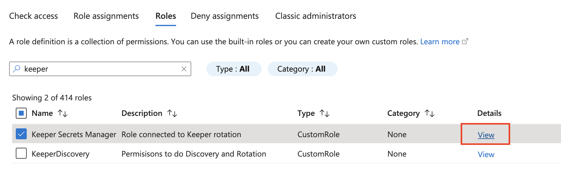 Once the role is created, it needs to be assigned to the Application (Service Principle). Click **View** in the **Details** column.