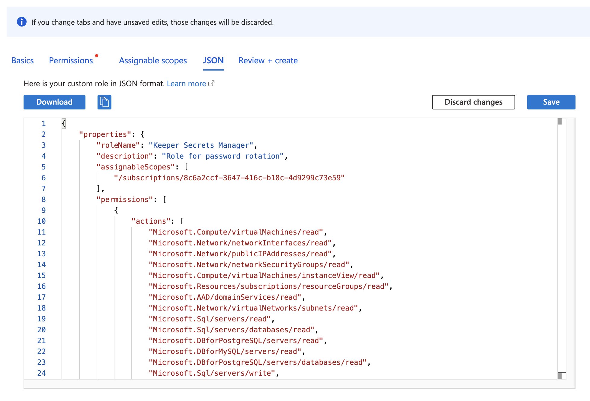 Click **Add** on the top menu, and then **Add custom role**. Jump to the **JSON** tab. Click on **Edit** and paste the JSON object from below, modifying it according to your setup.