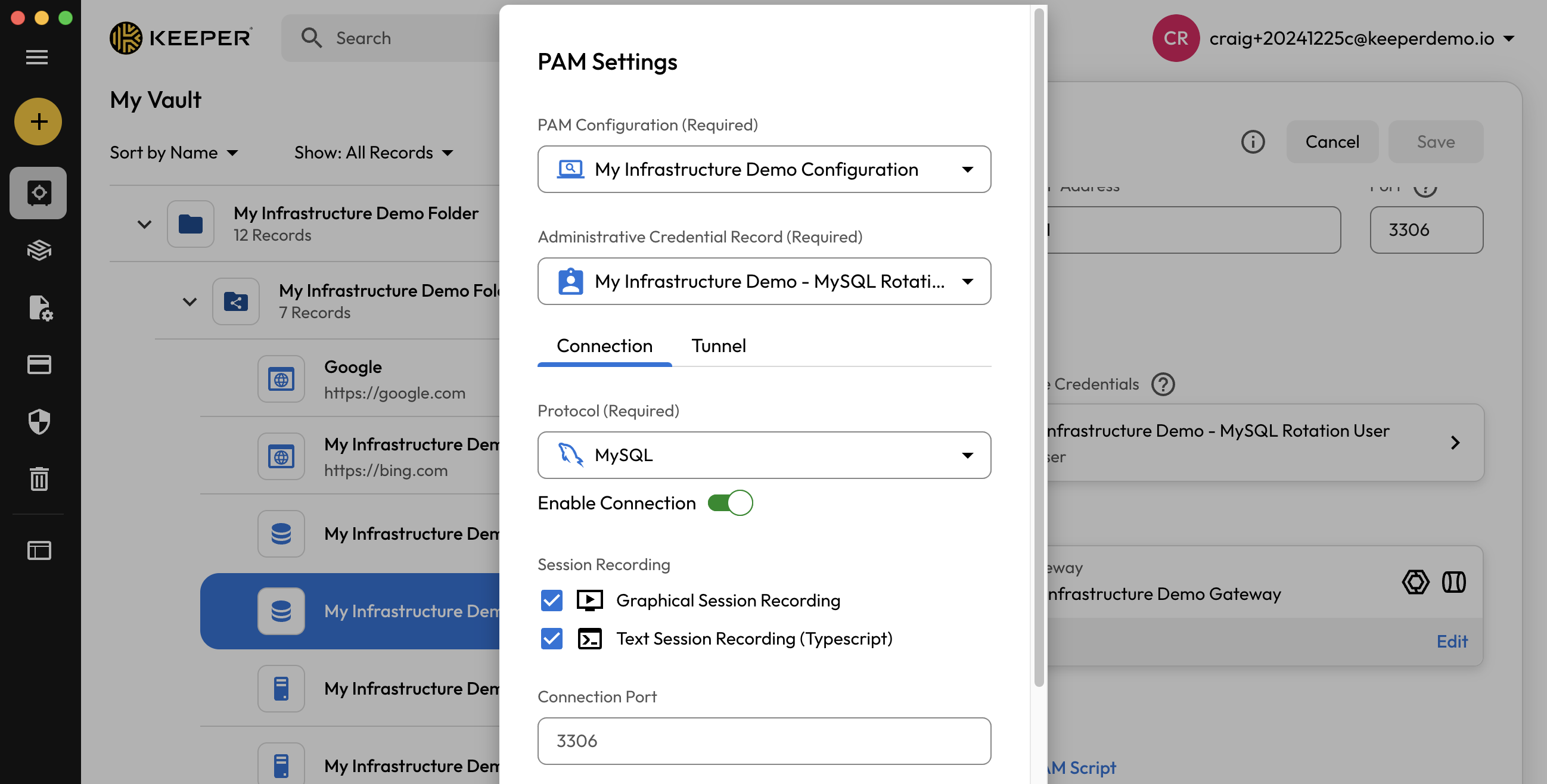 On the "PAM Settings" section of the vault record, you can configure the KeeperPAM Connection and Tunnel settings and link a PAM User credential for performing rotations and connections. Tunnels do not require a linked credential.