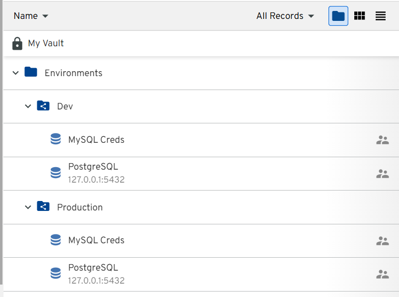 In this example, two shared folders have been created. One for developer environments and one for production. Inside each folder there are identically named records. These records have the same name, but different credentials stored in them.