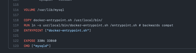From the MySQL Dockerfile, the **ENTRYPOINT** is `["docker-entrypoint.sh"]` and the **CMD** is `["mysqld"]`. This means the **ENTRYPOINT** will be prepended to the **CMD**, so when the container is started `docker-entrypoint.sh mysqld` will be executed.