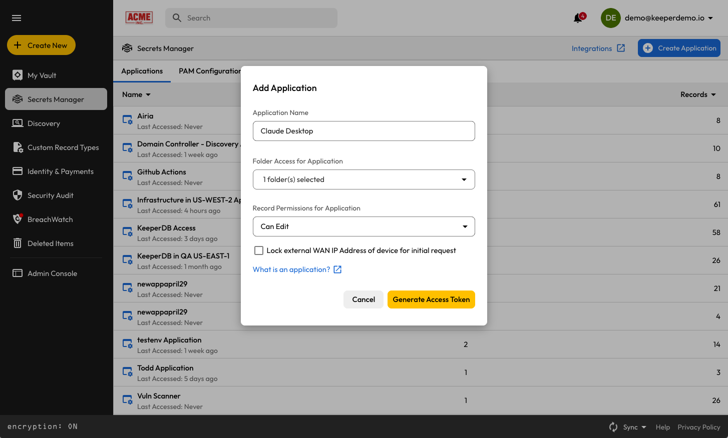 From Keeper Secrets Manager, create an Application or use an existing application.