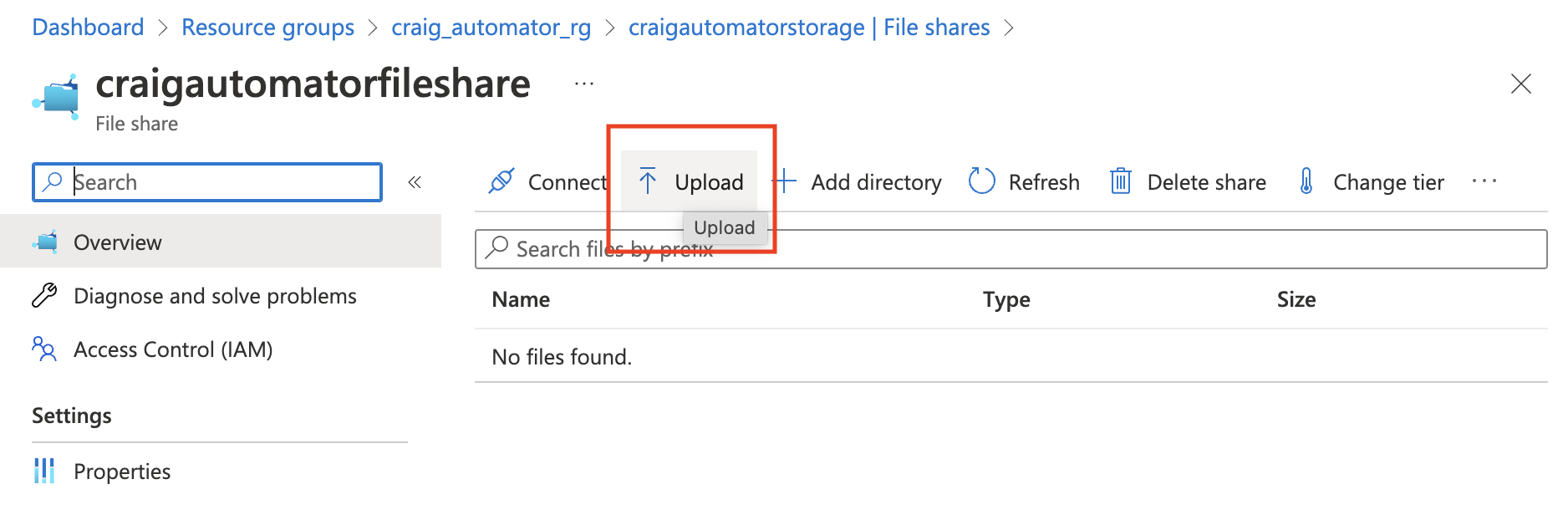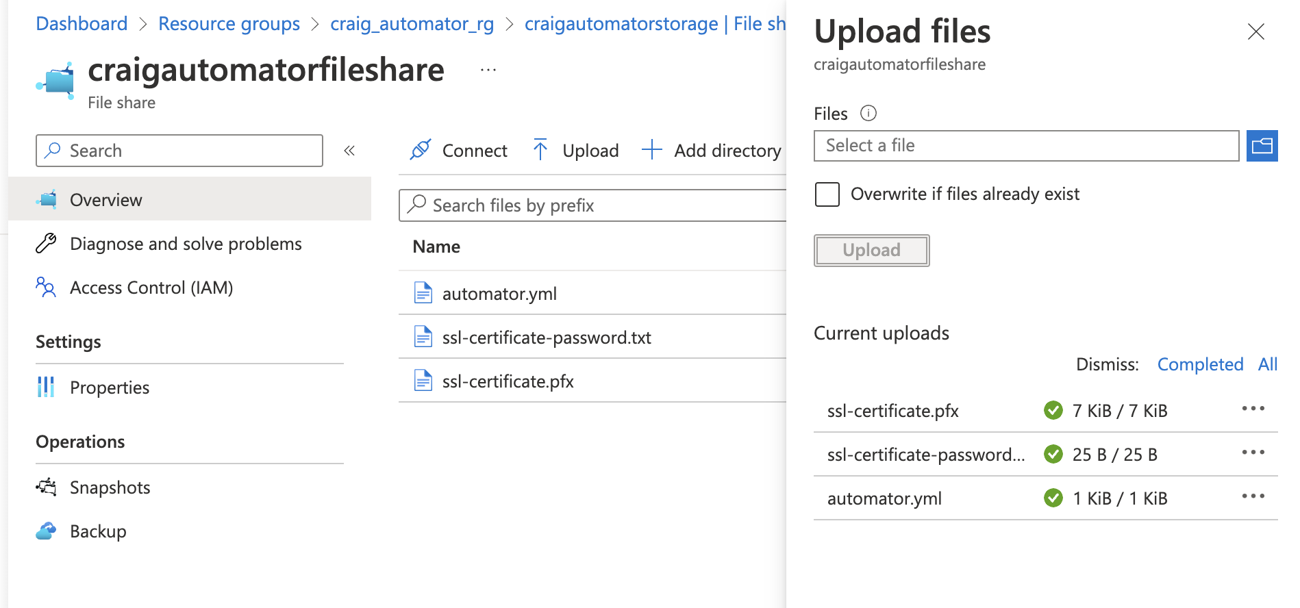 From the Azure interface, navigate to the Resource Group > Storage Account > File Share > into the Automator file share created. From here, upload the automator.yml file, SSL certificate file and SSL certificate password file.
